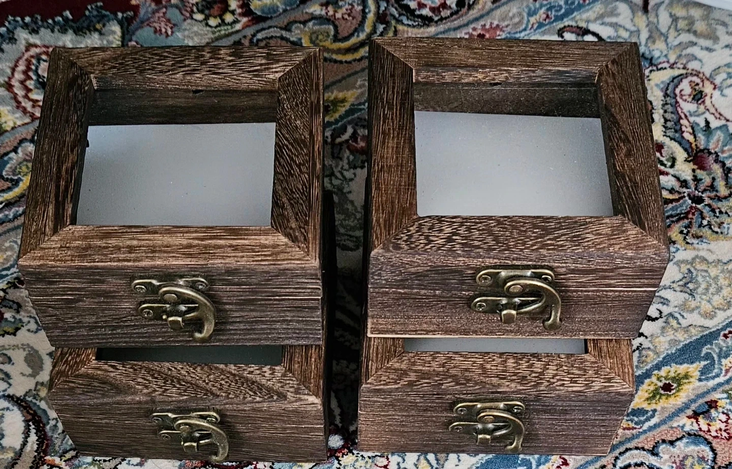These two wooden shadow boxes feature hinged lids and metal clasps. The interior is frosted white, perfect for displaying small treasures. Great for small keepsakes or trinkets!