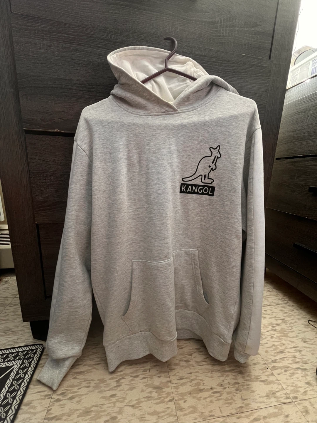 0Selling a comfy Kangol hoodie! It's a nice grey colour and has the classic Kangol logo on the front and back. Perfect for layering or just lounging around