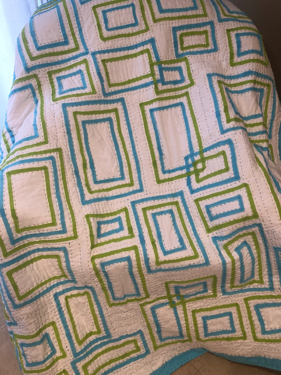 Beautiful handmade Kantha quilt. Features a vibrant geometric pattern in shades of blue and green. Soft cotton fabric. Perfect for adding a touch of colour and warmth to any room.