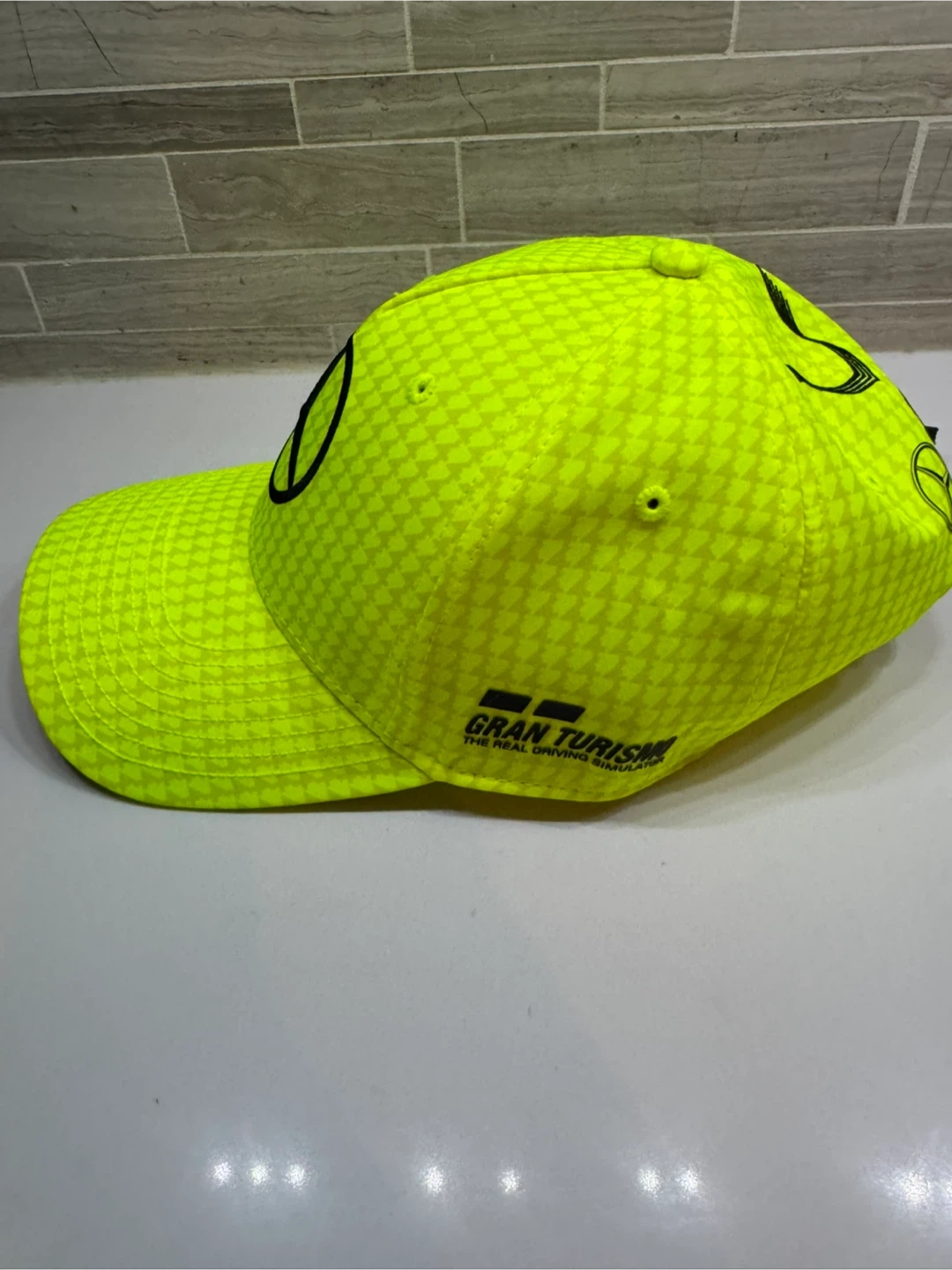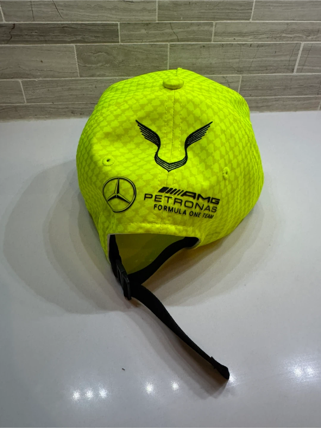 Neon yellow baseball cap with the Mercedes-AMG Petronas Formula One Team branding. Features an adjustable strap for a comfortable fit. A great piece for any racing fan!