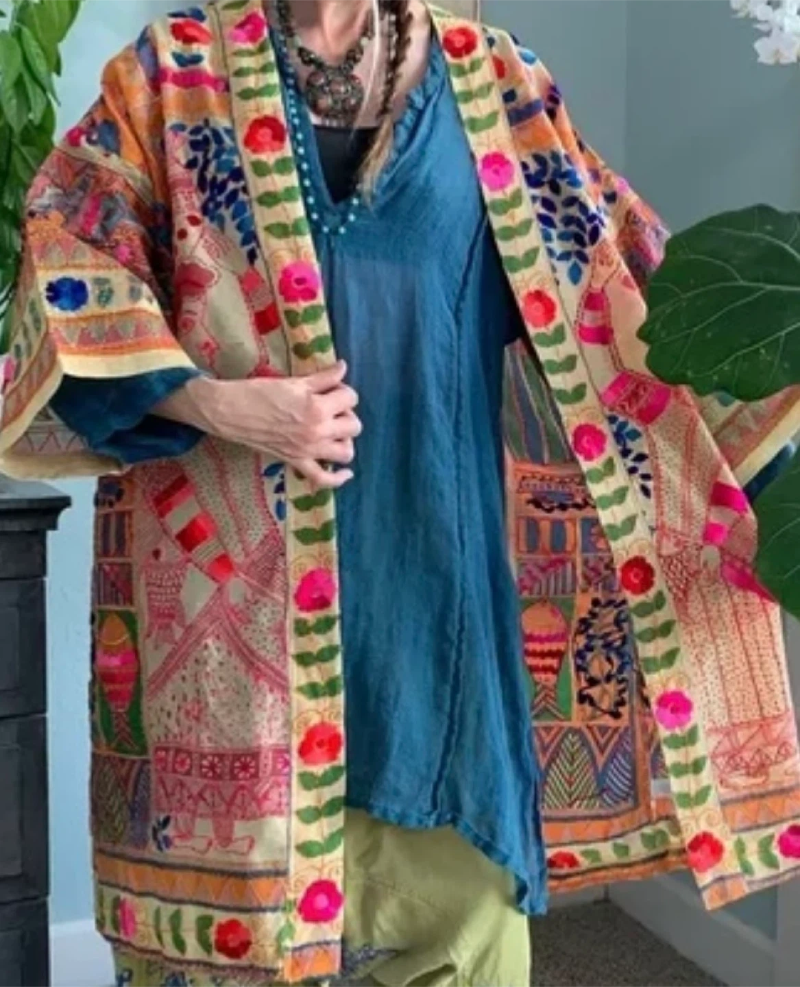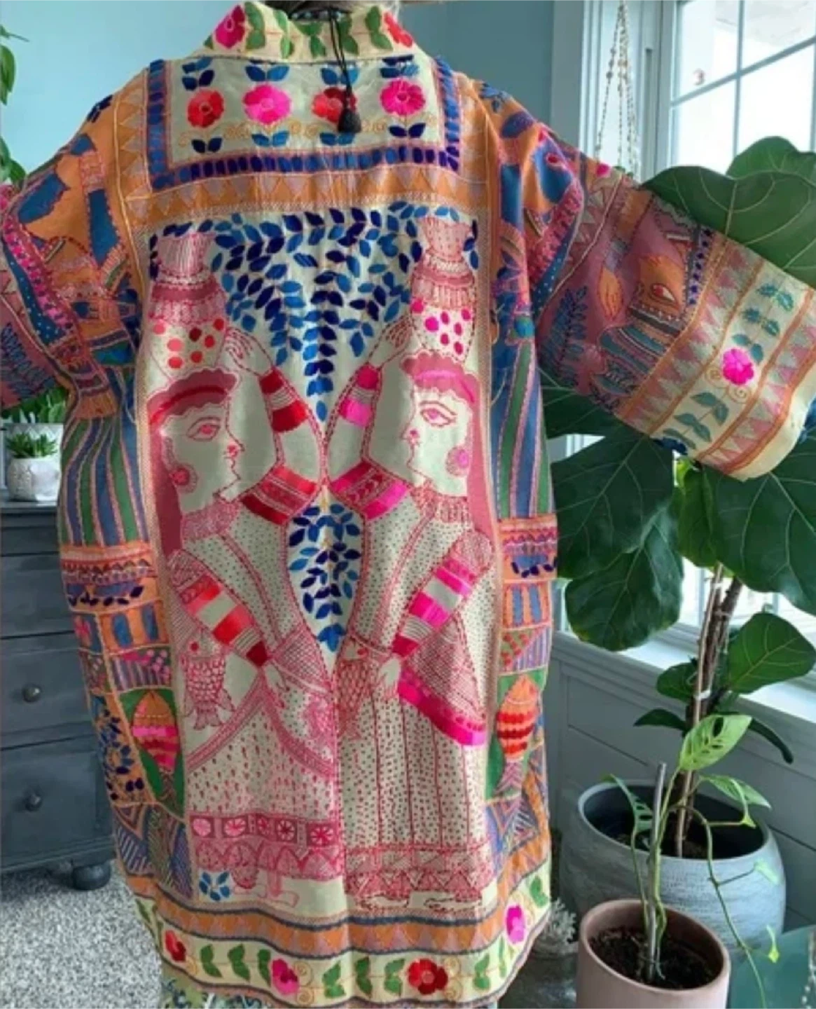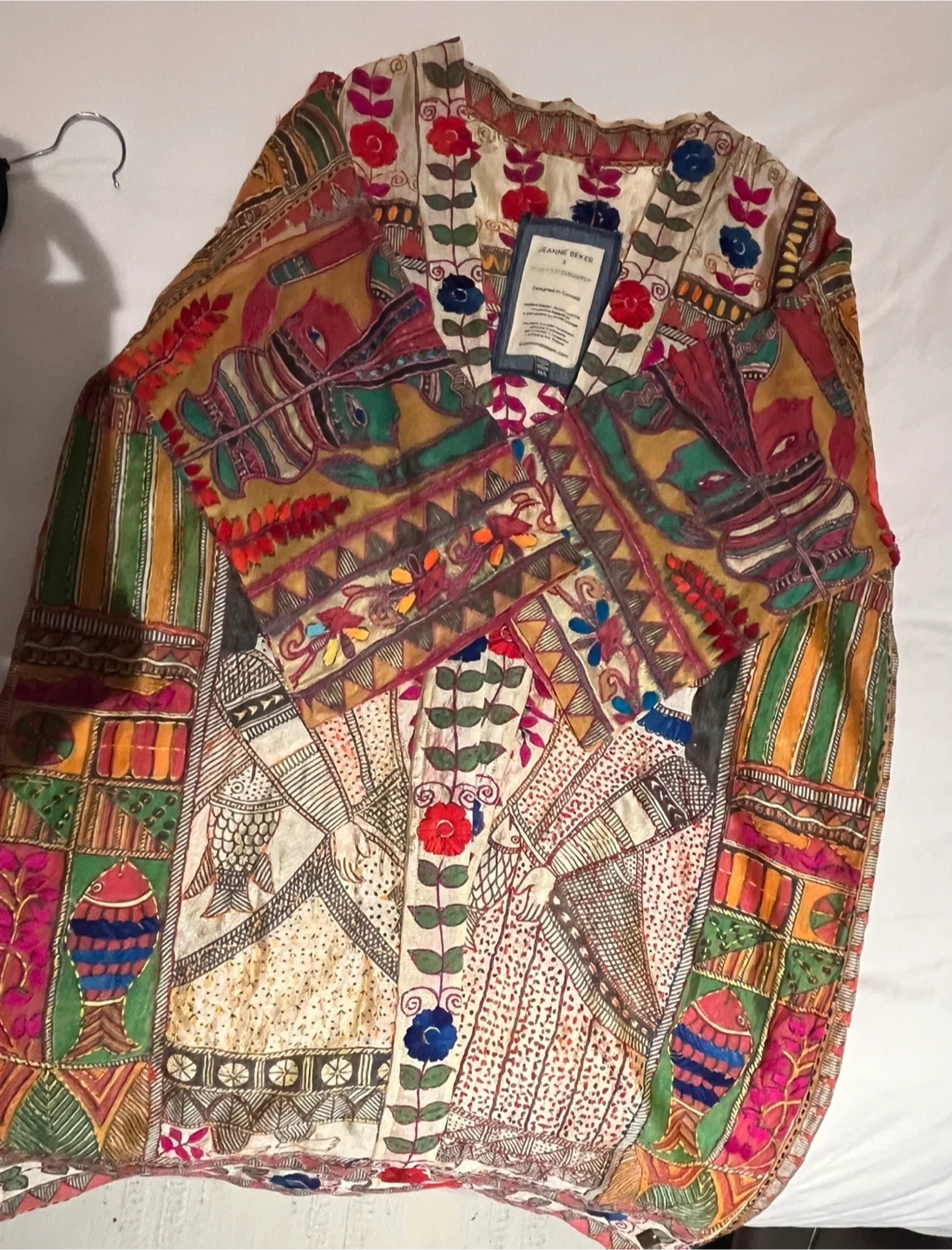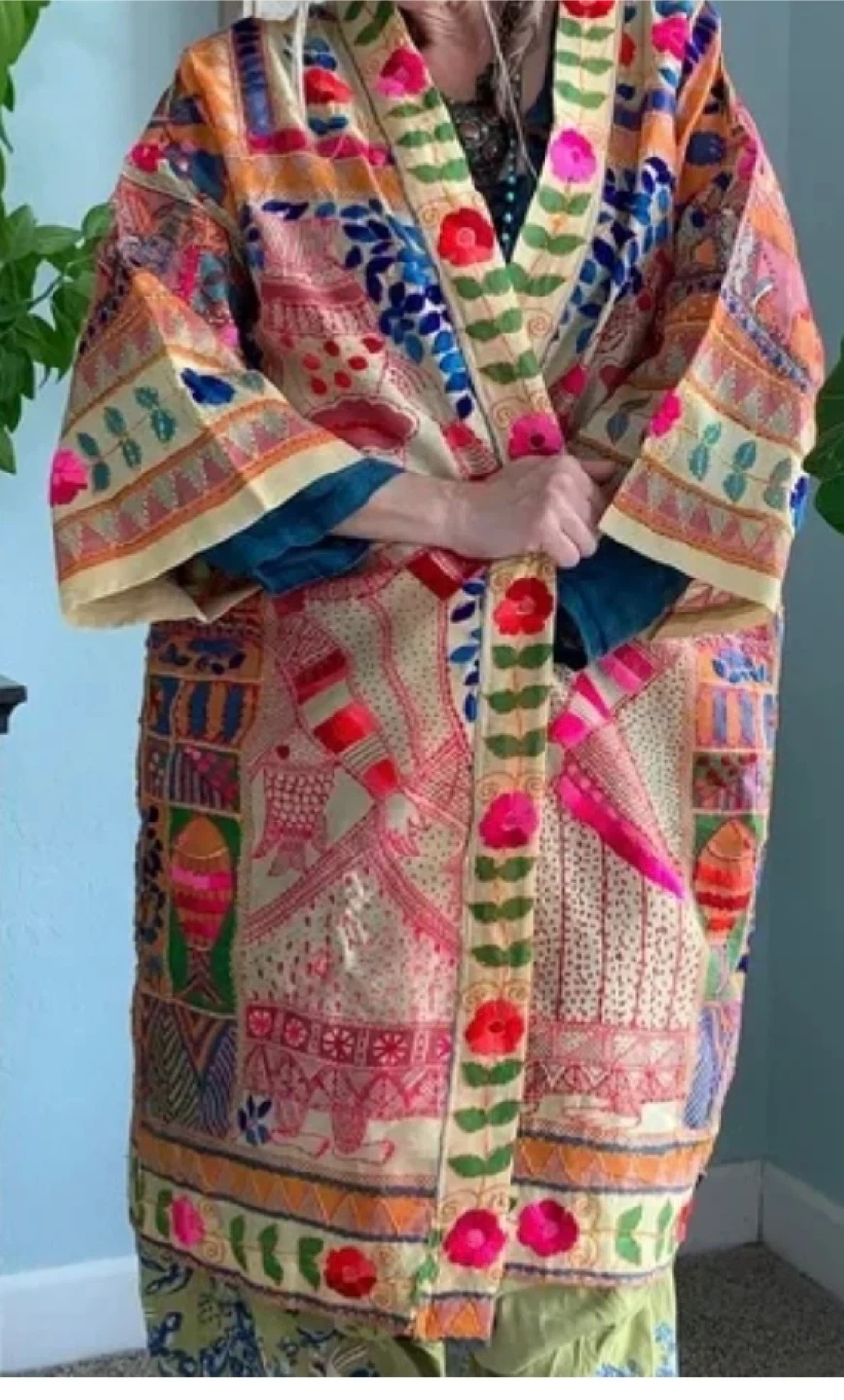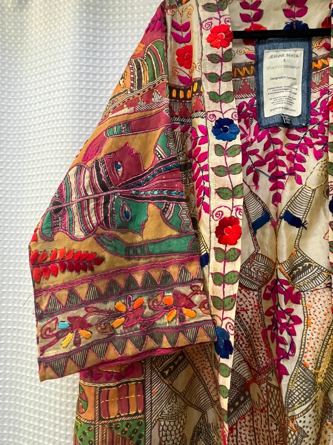 Beautifully designed kimono from Jeanne Beker x Shannon Passero. Features intricate embroidery and a vibrant, unique print. Designed in Canada. Made in Thailand. Size M/L. This kimono is a work of art. Tons of embroidery over Indian print. Lightweight and great for warm weather.