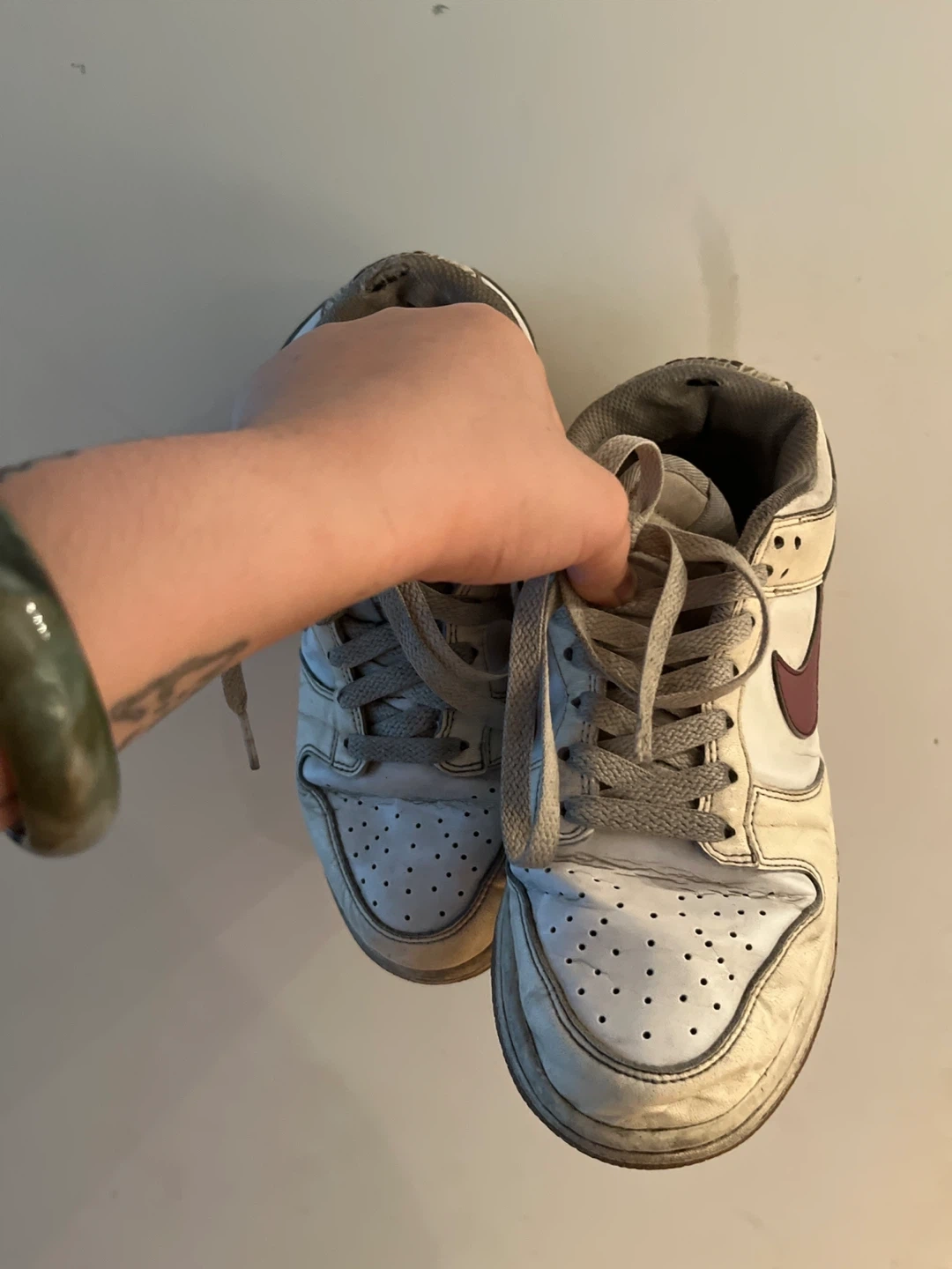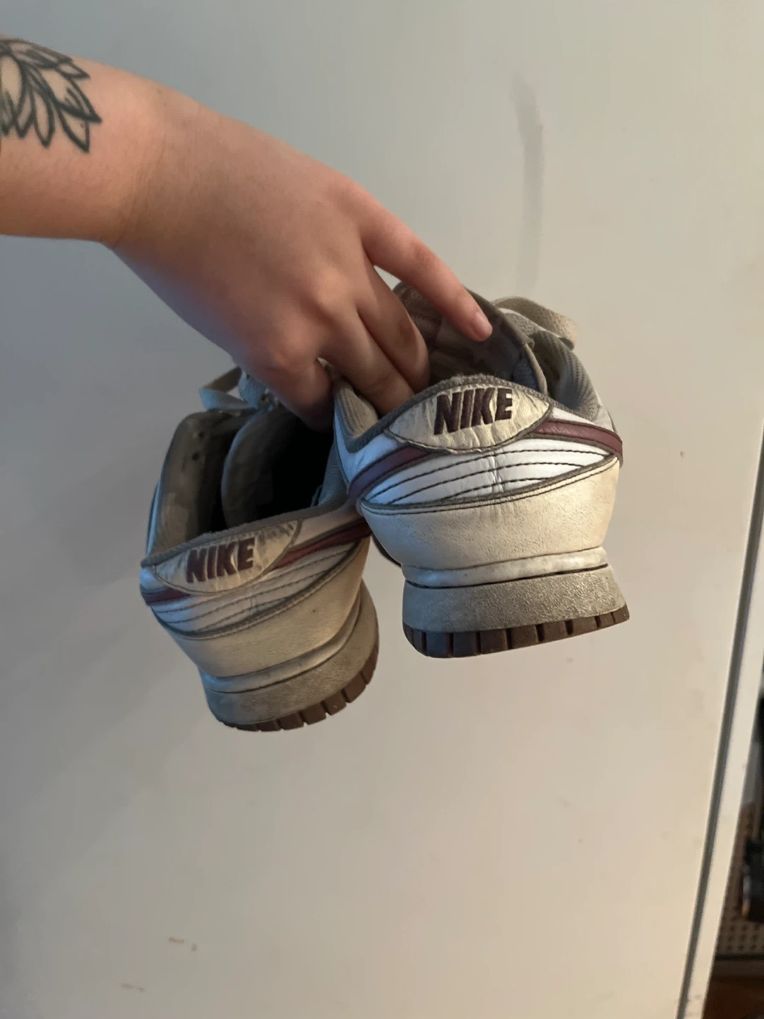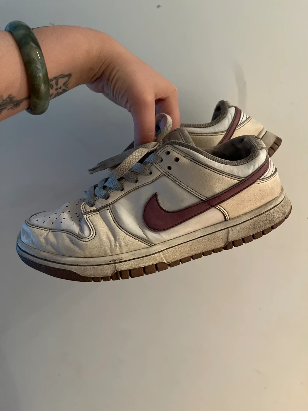 A pair of pre-owned Nike Dunk Low sneakers. These shoes feature a white leather upper with burgundy accents and a rubber sole. They're a classic low-top design.