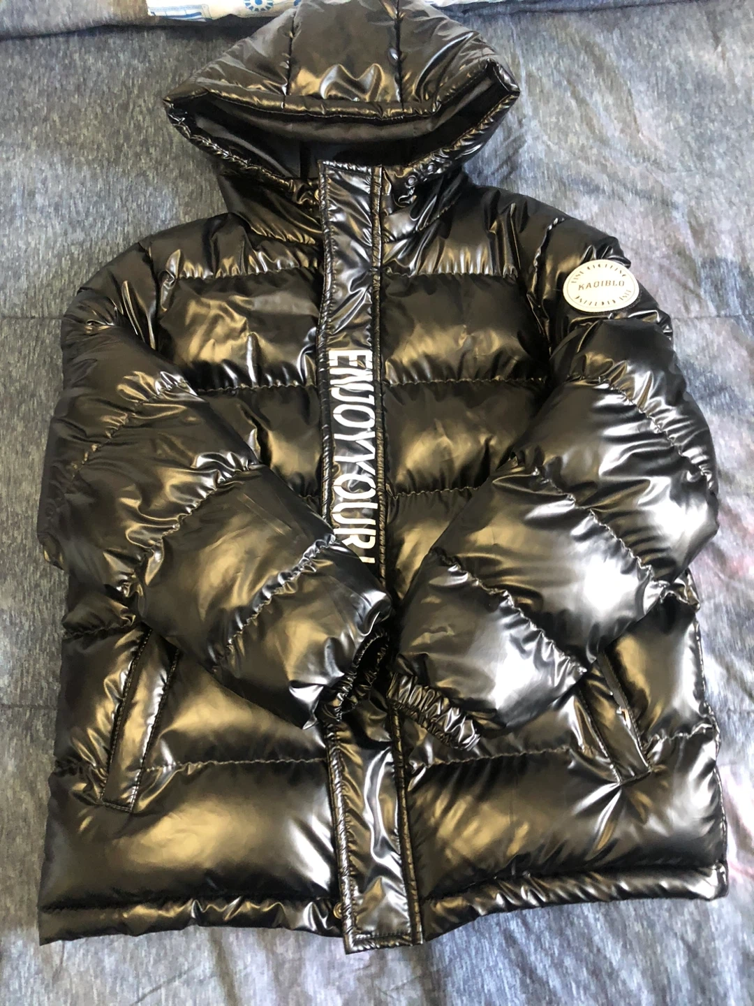 15Selling a Kaqiblo black puffer jacket! It's a stylish piece with "ENJOY YOUR LIFE" printed on the front and a fashionable design on the back. The size is 150cm, perfect for kids' fashion. It's in great condition and ready for a new home and size large