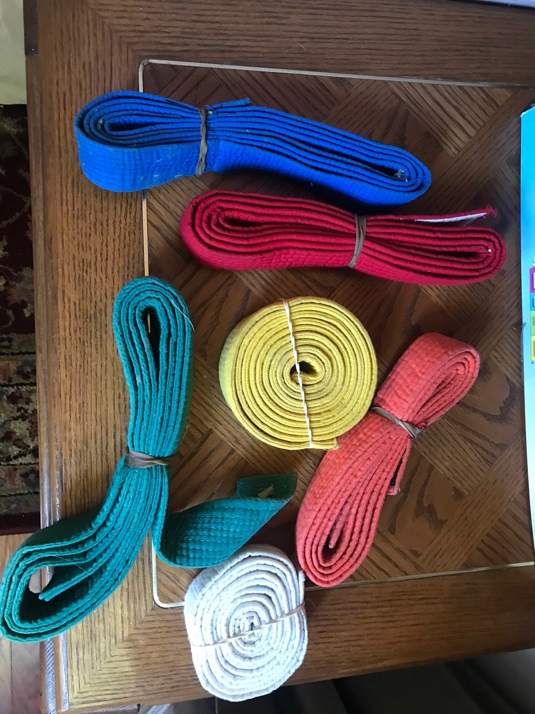 375$ each. Selling a set of karate belts in various colours. Includes blue, red, green, yellow, orange, and white. Great for martial arts training!