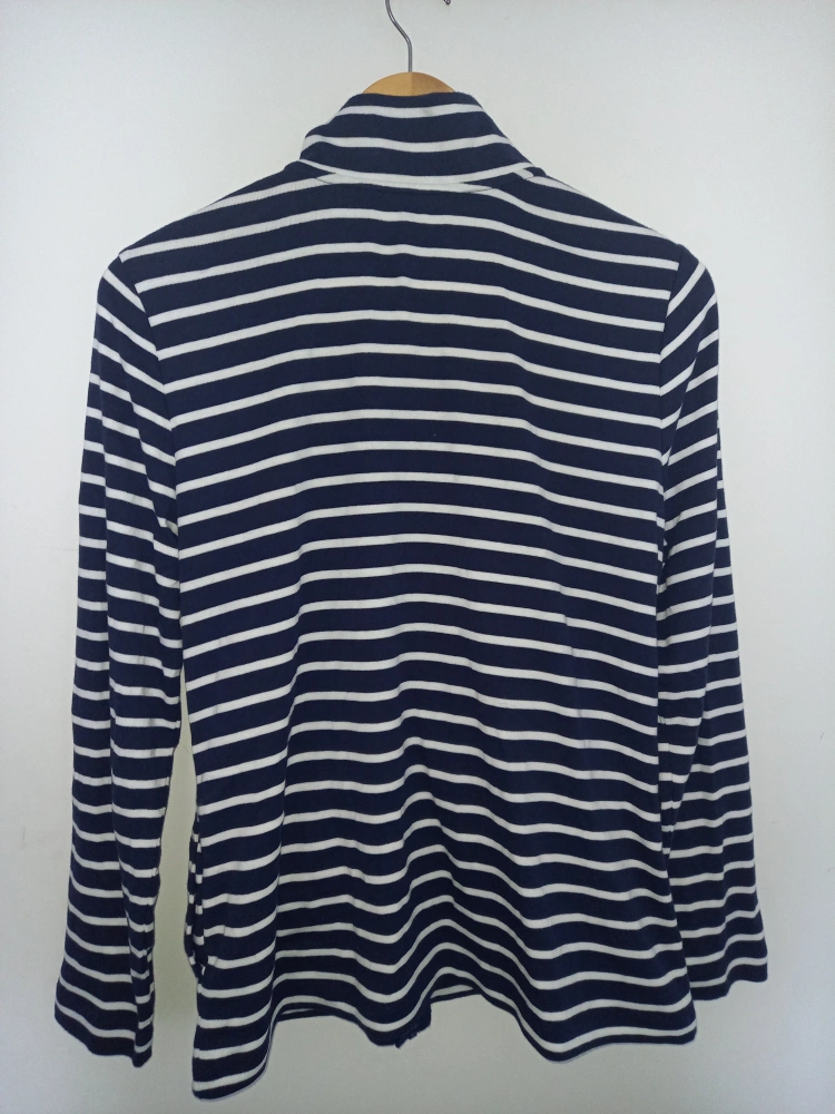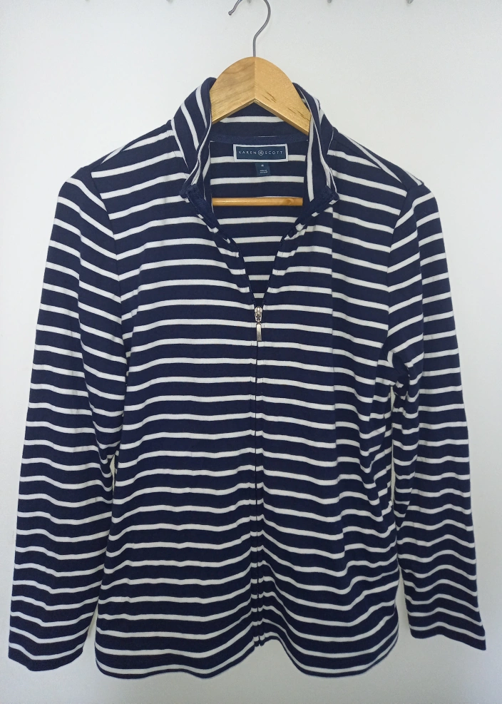 This is a Karen Scott striped zip-up jacket. It features a navy and white striped pattern and a full zip closure. Perfect for layering or wearing on its own, this jacket is a stylish and comfortable addition to any wardrobe. Size: Small — Medium