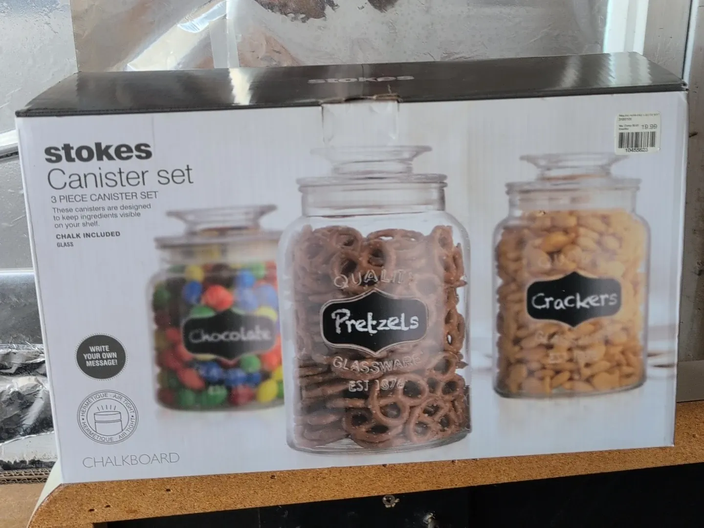 Set of 3 Stokes glass canisters with airtight lids. Includes chalk for writing messages on the chalkboard labels. Designed to keep ingredients visible on your shelf.