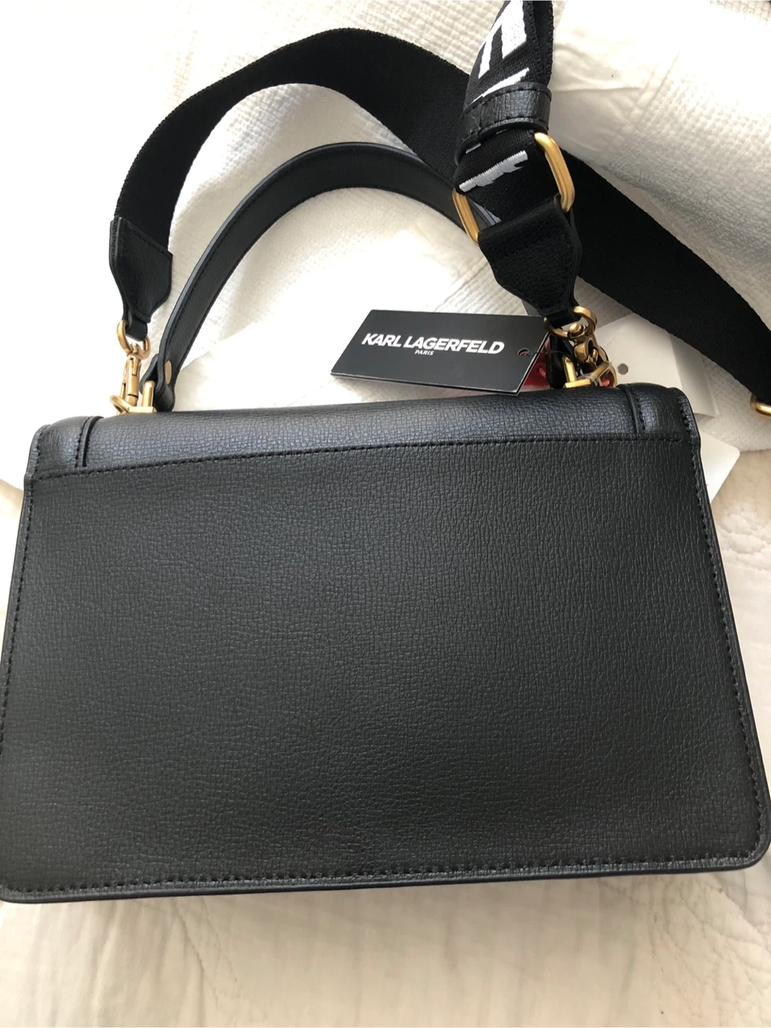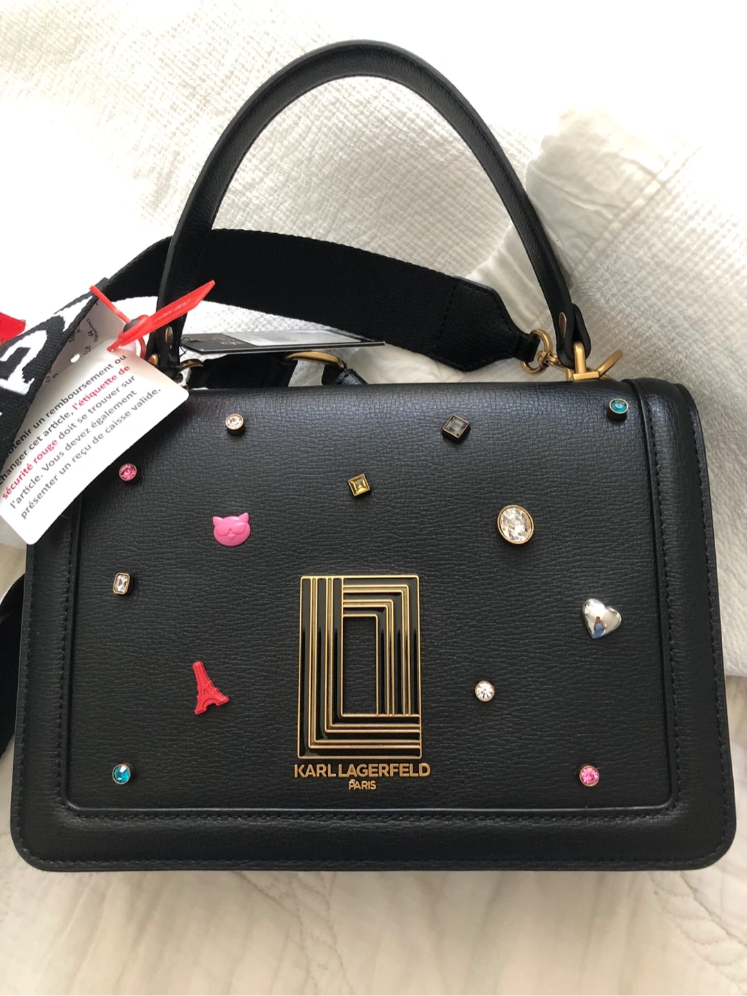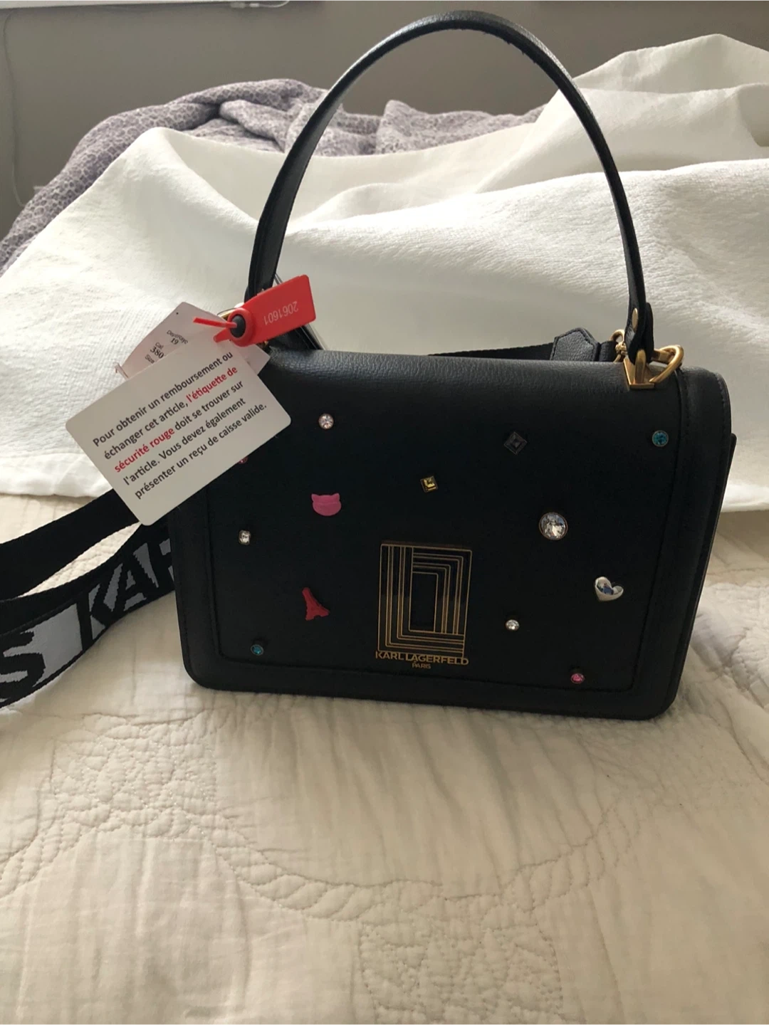 71Selling a Karl Lagerfeld crossbody bag in black leather. It features decorative embellishments and a logo design. The bag has a detachable strap. $130 Union station