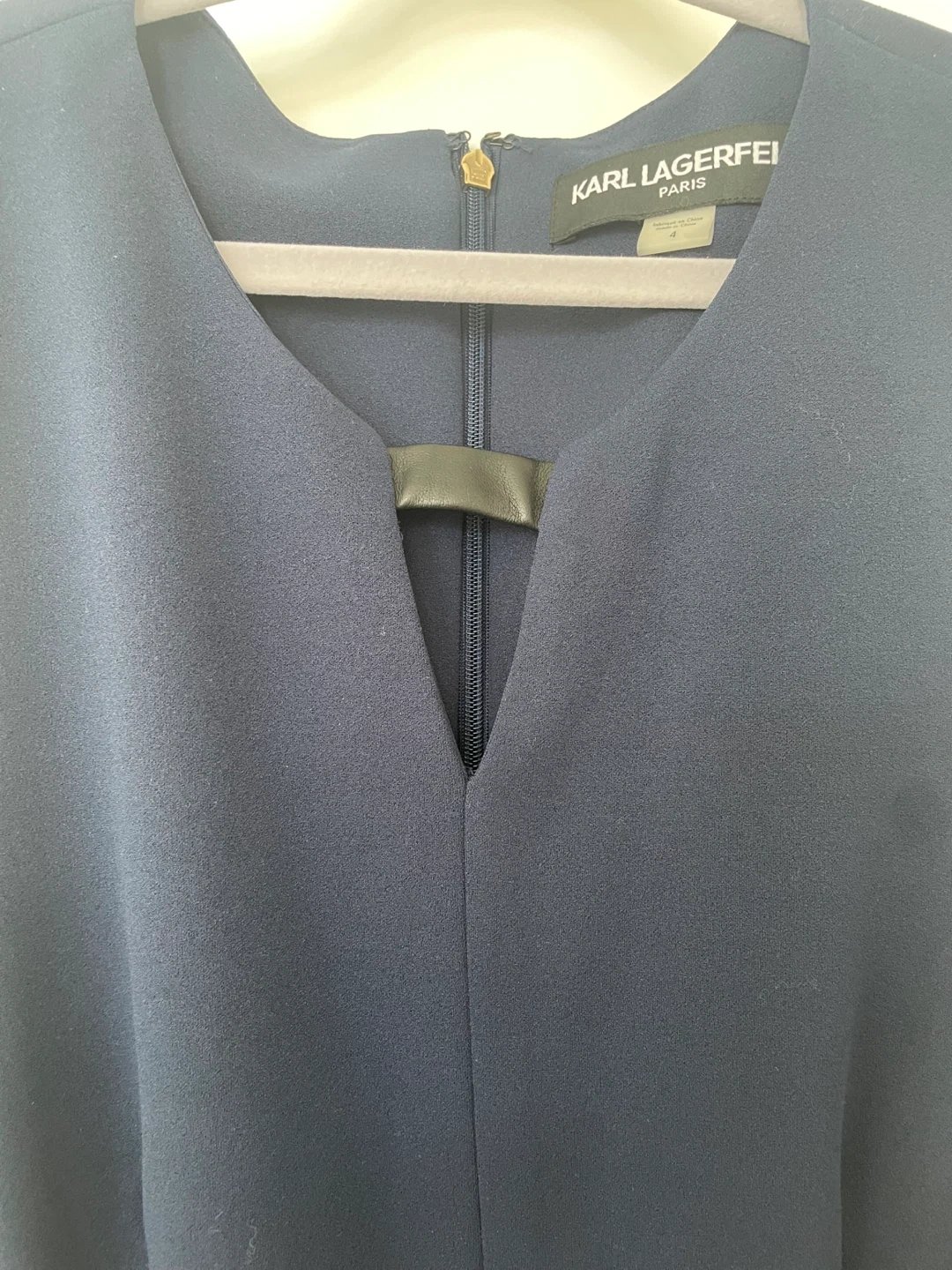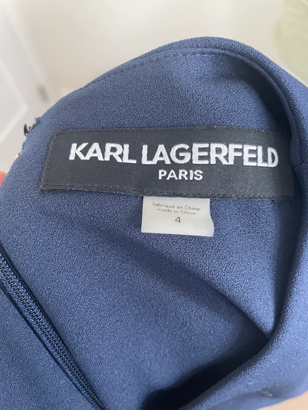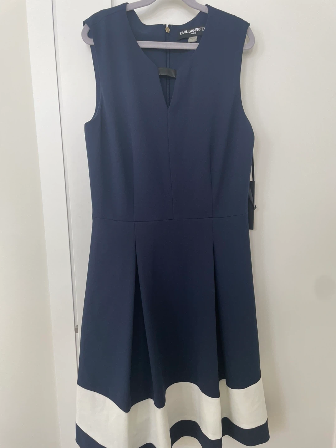 5Selling a NEW Karl Lagerfeld Paris dress in navy blue with white accents at the bottom. It's a size 4 and features a unique V-neck design. Originally priced at $189.00!