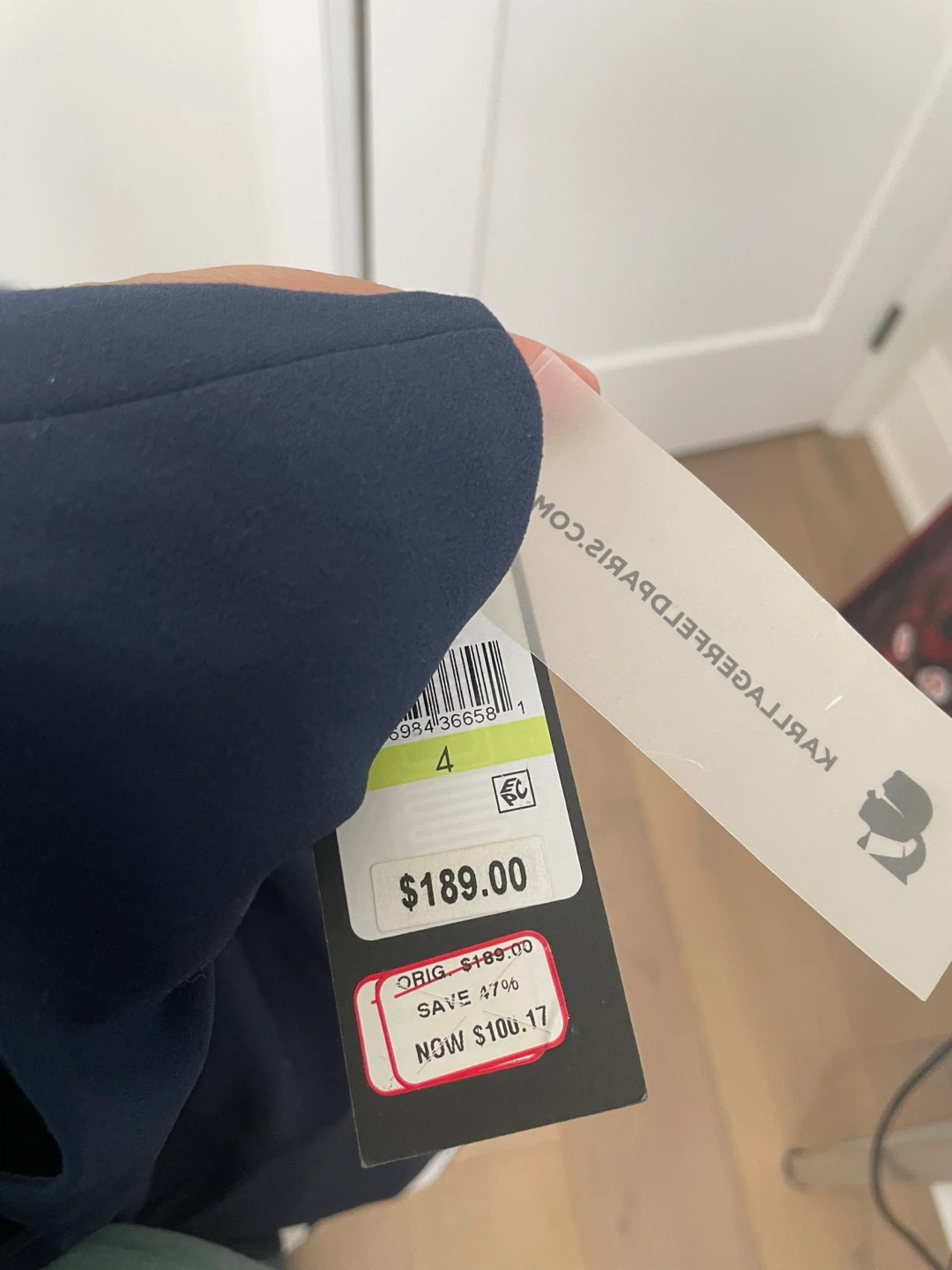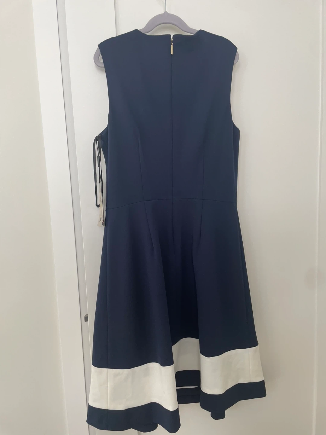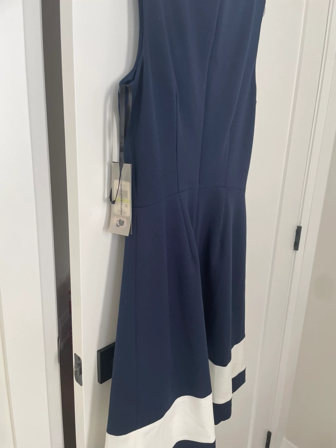 5Selling a NEW Karl Lagerfeld Paris dress in navy blue with white accents at the bottom. It's a size 4 and features a unique V-neck design. Originally priced at $189.00!