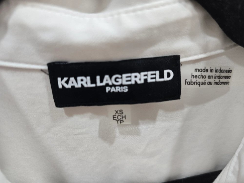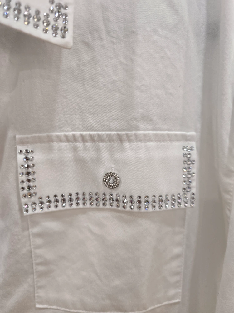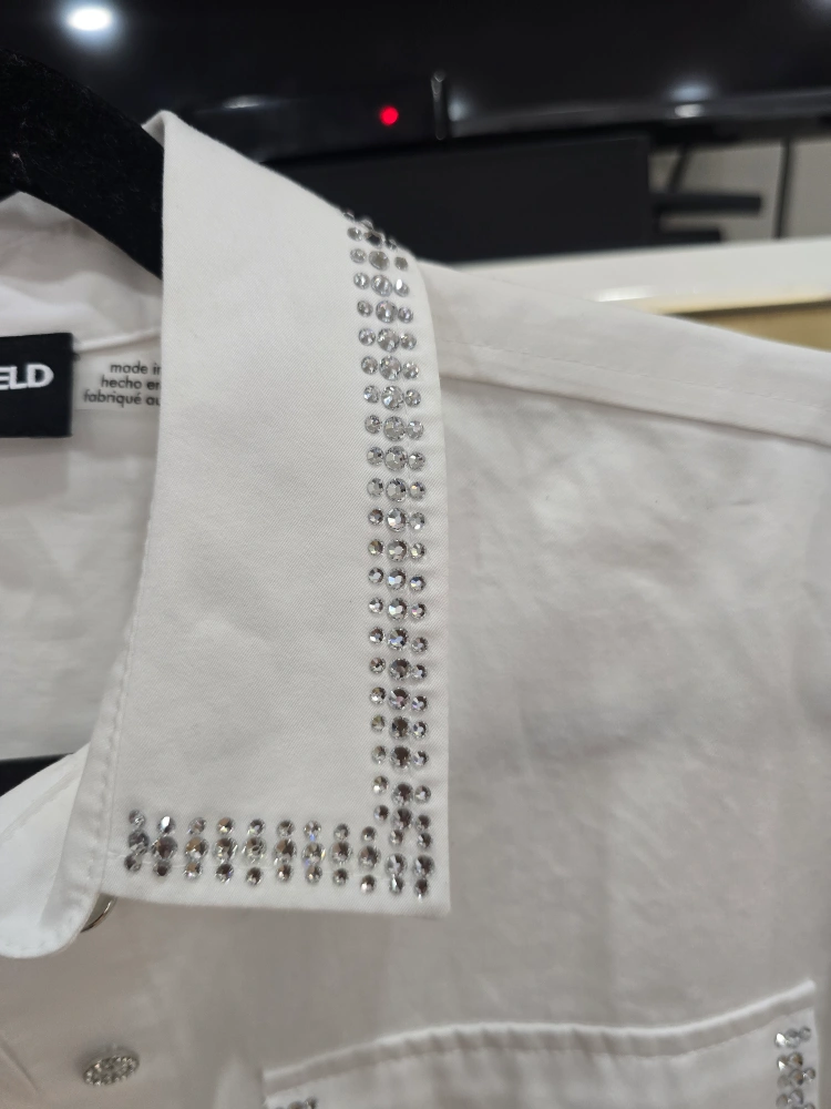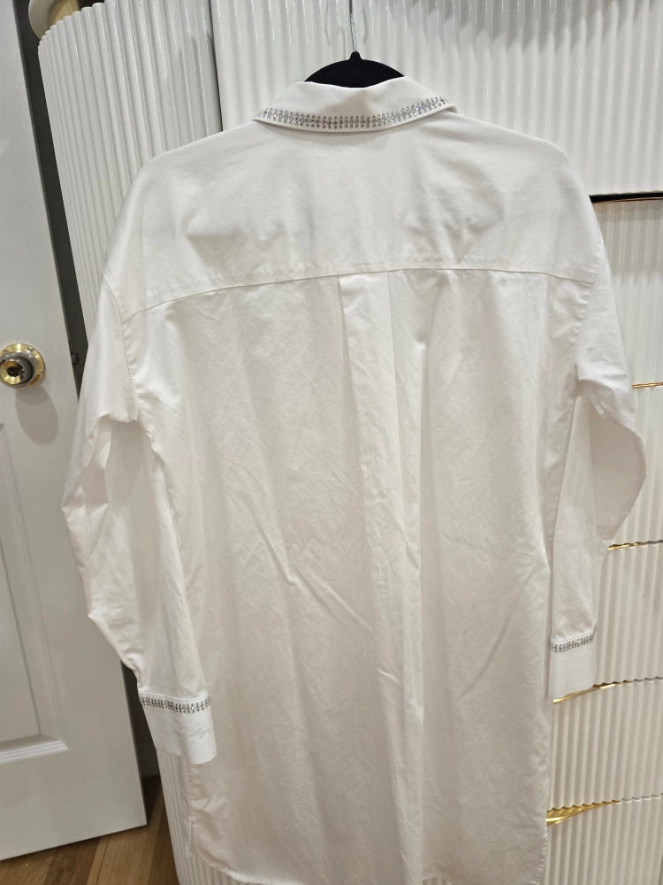 Selling a Karl Lagerfeld white shirt dress. It has beautiful rhinestone embellishments on the collar, cuffs, and pockets. Perfect for adding a touch of sparkle to your wardrobe!