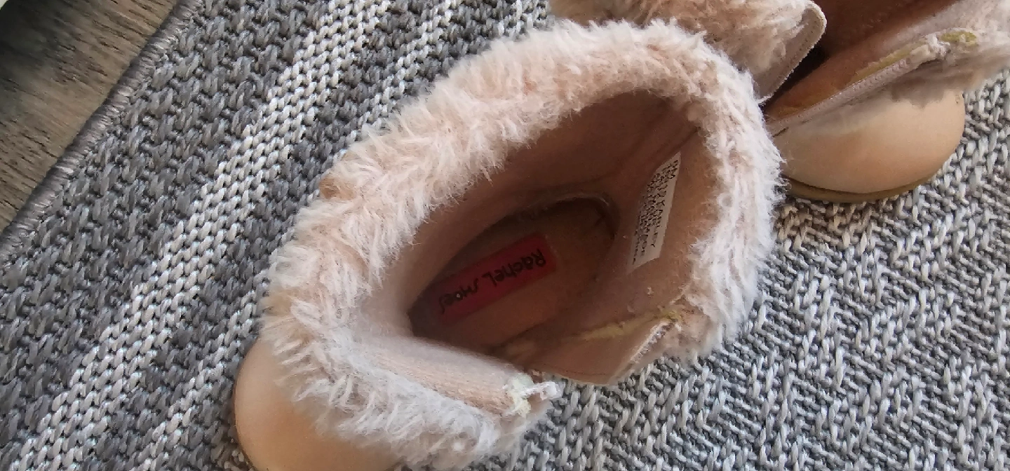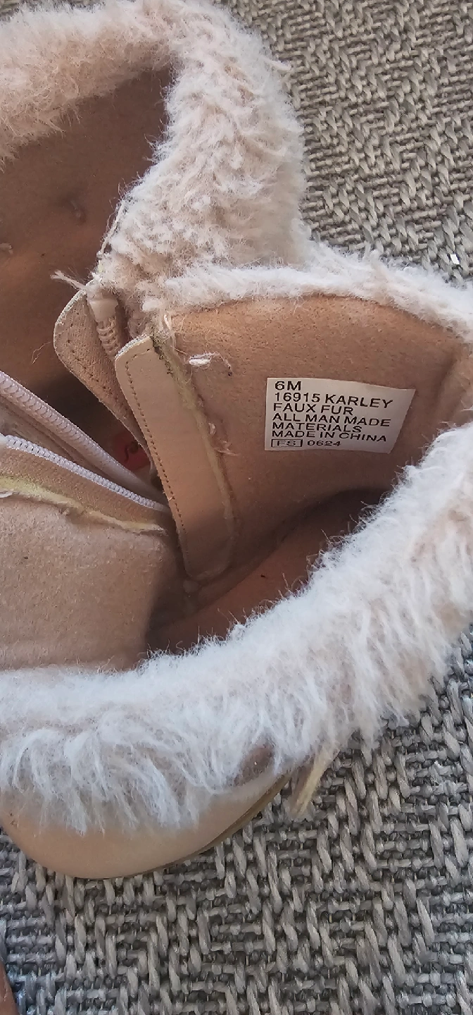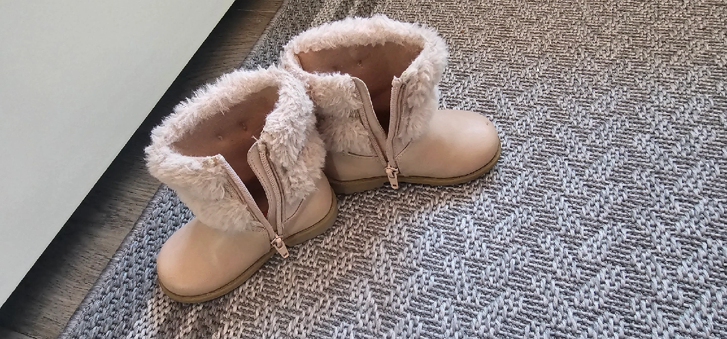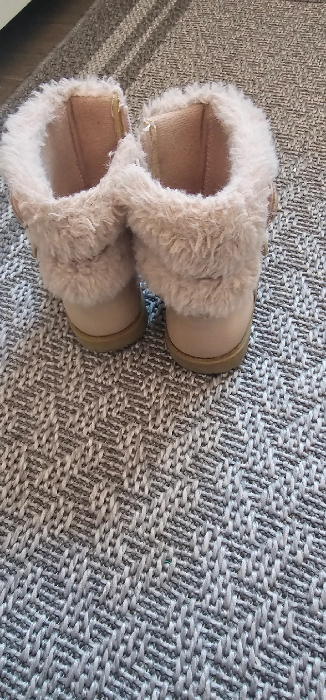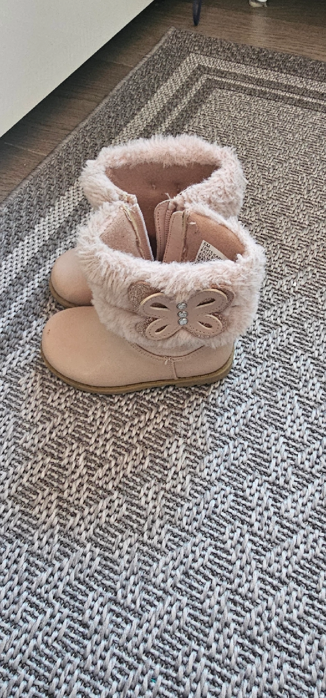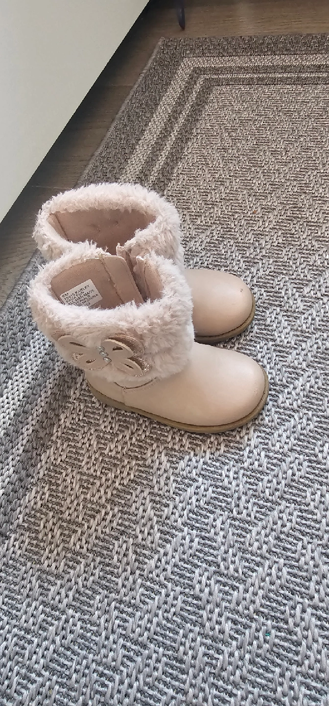 7Cute Karley brand kids boots in a size 6M. These are a light pink colour with faux fur trim. They have a zipper closure for easy on and off, and a sweet butterfly detail on the side