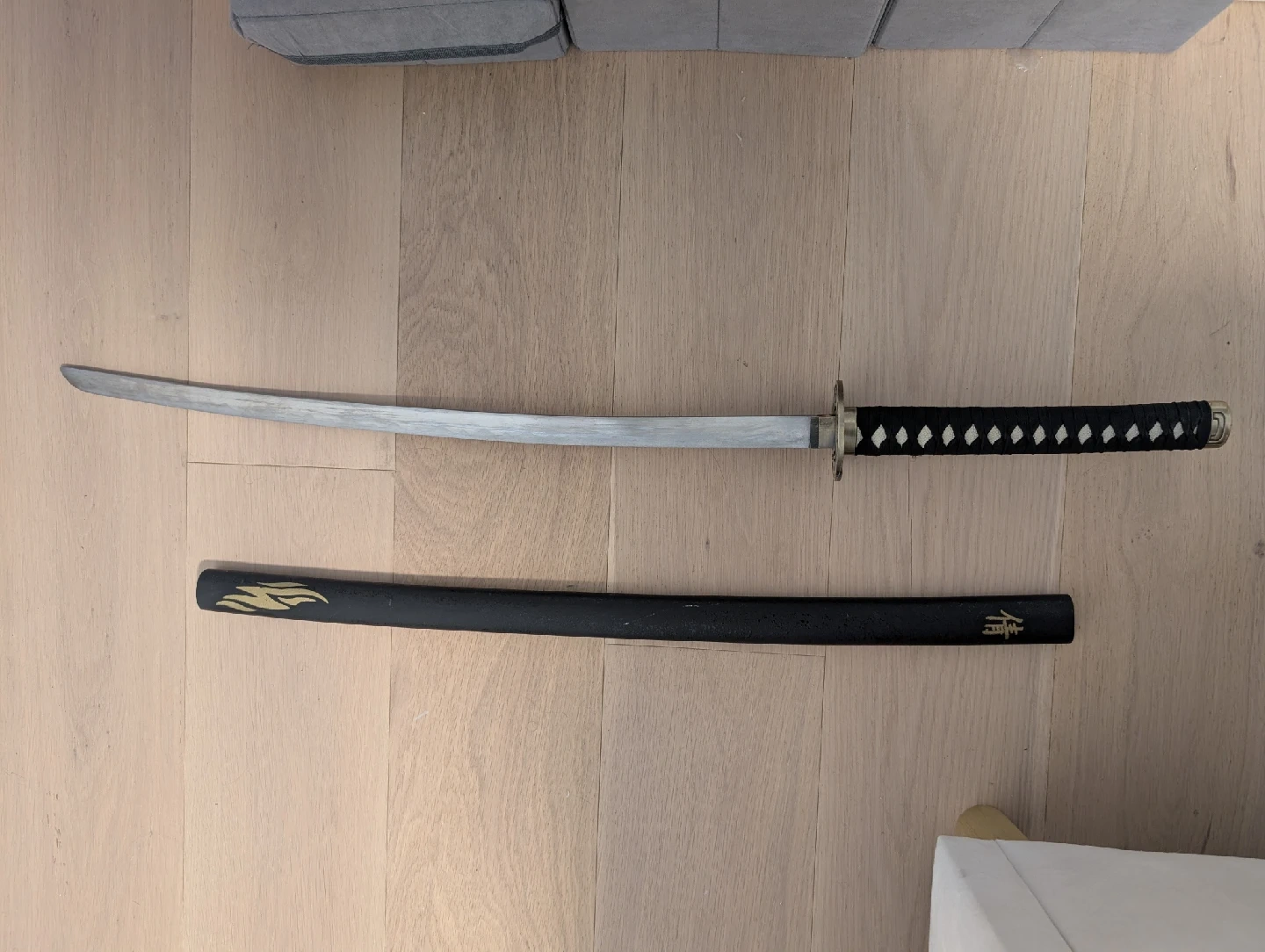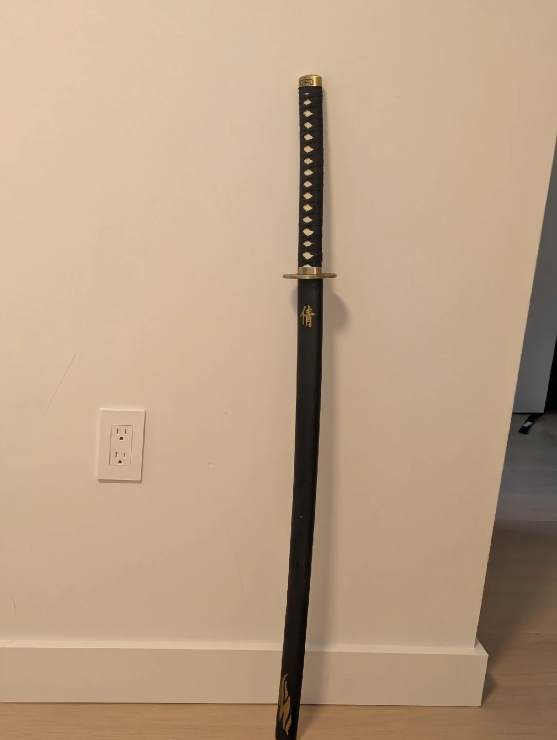 10Selling a genuine metal katana sword. 倩 kanji on the sheath meaning: beautiful or graceful. It has a black handle and sheath with gold accents. The blade is silver. 38 inches long. Purchased directly from smith in 2018. Blade has no wear as it has never been sharpened, though can be sharpened if desired.