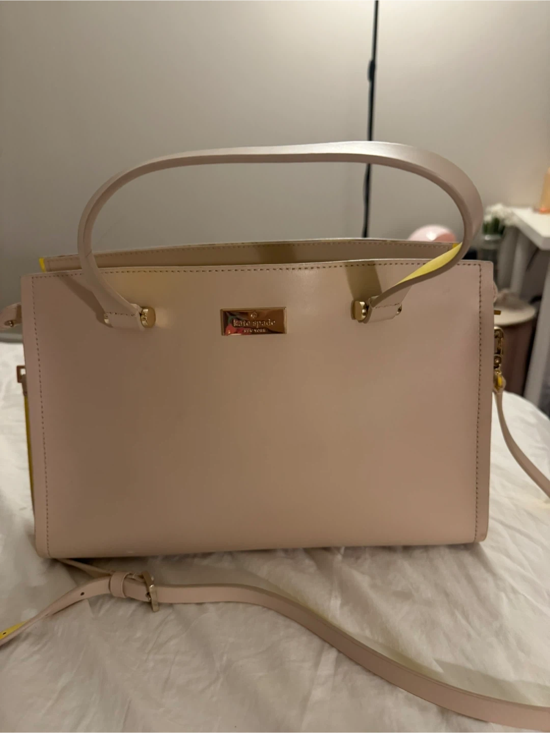 Selling a Kate Spade Arbour Hill Caley Satchel in a lovely neutral colour! It's in great condition and perfect for everyday use. The satchel features yellow accents and a crossbody strap for added versatility (Shoulder Strap Drop Max: 21" Shoulder Strap Drop Min: 19" Handle Drop: 5" Height: 9" Width: 13" Depth: 5")