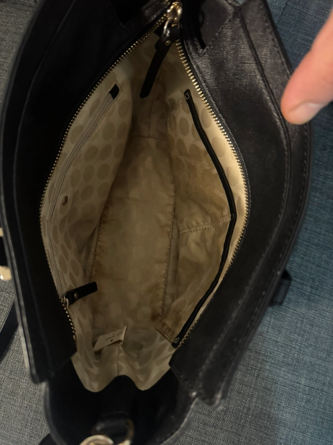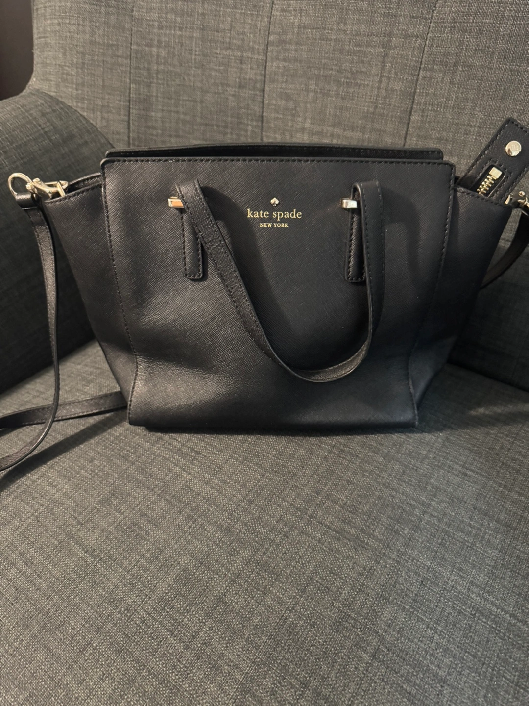 Black handbag with an interior zipper pocket. Includes a removable shoulder strap. Ideal for keeping your essentials organized in style.