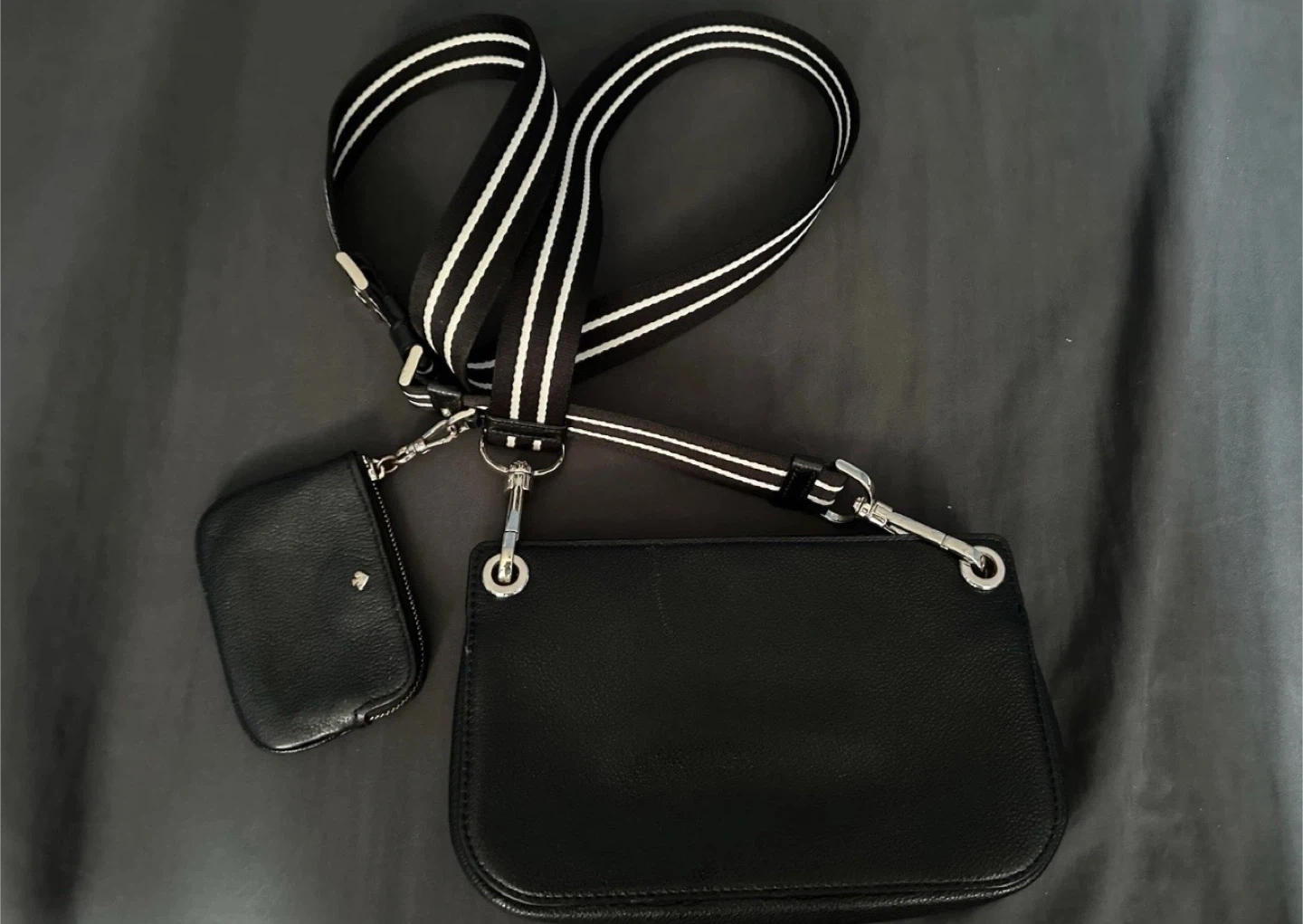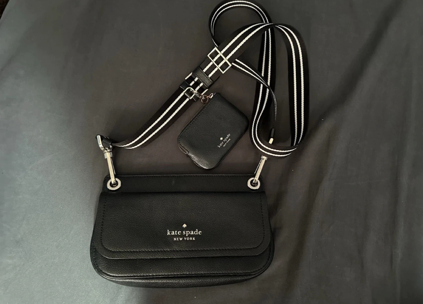 Selling a stylish Kate Spade crossbody bag in black leather! It's in great condition and features a detachable coin purse. The strap is black and white. Perfect for everyday use!