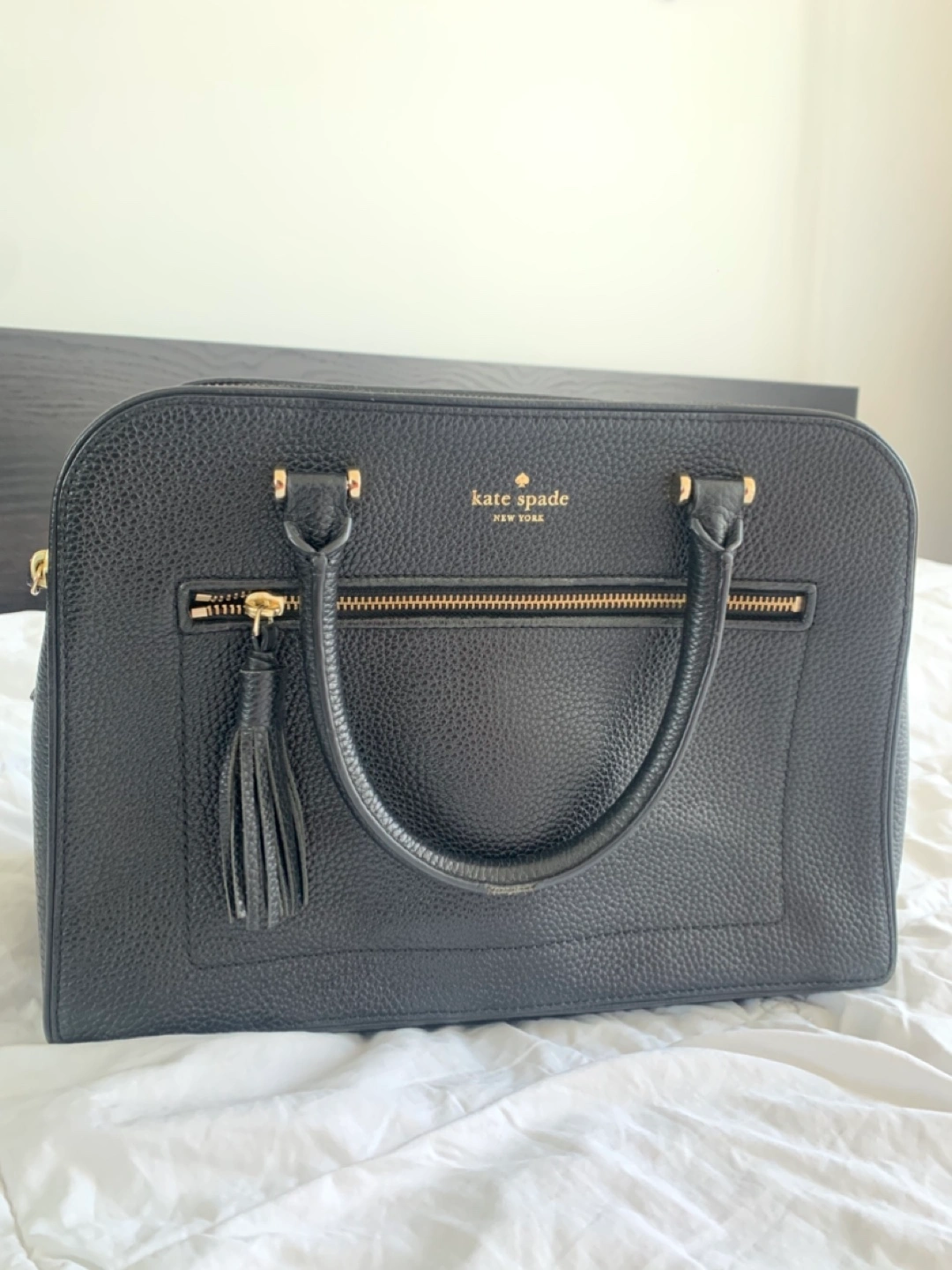 Selling a classic Kate Spade satchel in black leather. It's in great condition and perfect for everyday use or a night out. The bag features a zip-top closure, a tassel detail, and comfortable handles. A stylish and practical addition to any wardrobe!