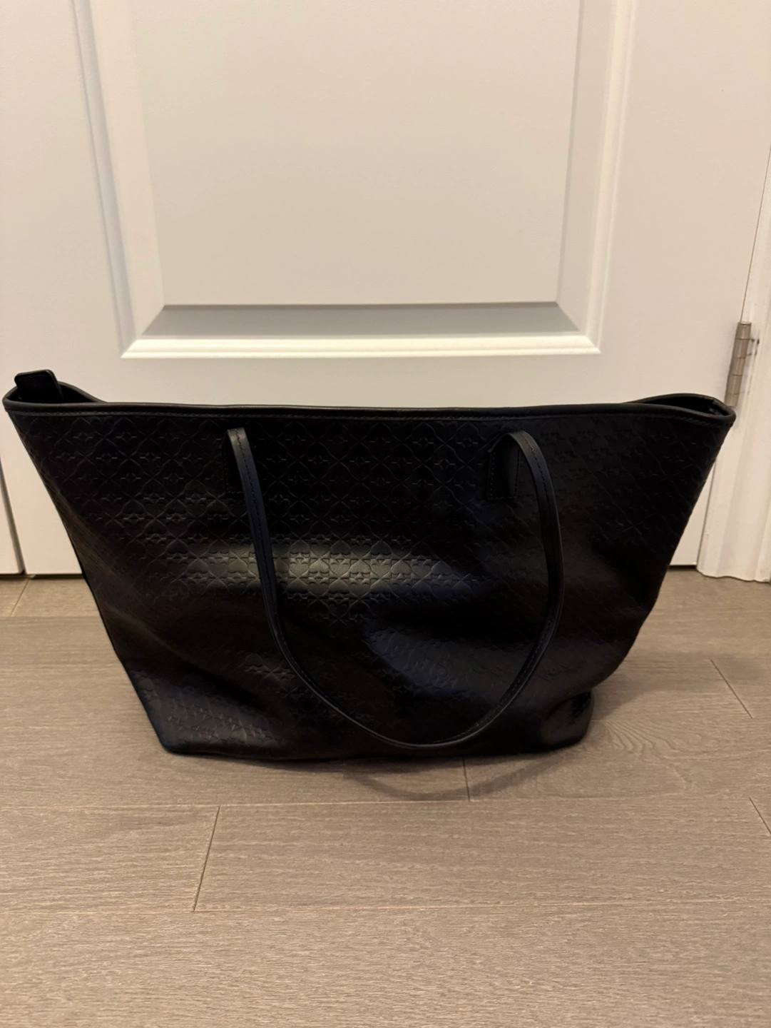 Large black tote bag. Embossed pattern. Top zip closure. Two carrying handles. Interior zip pocket. Spacious main compartment.