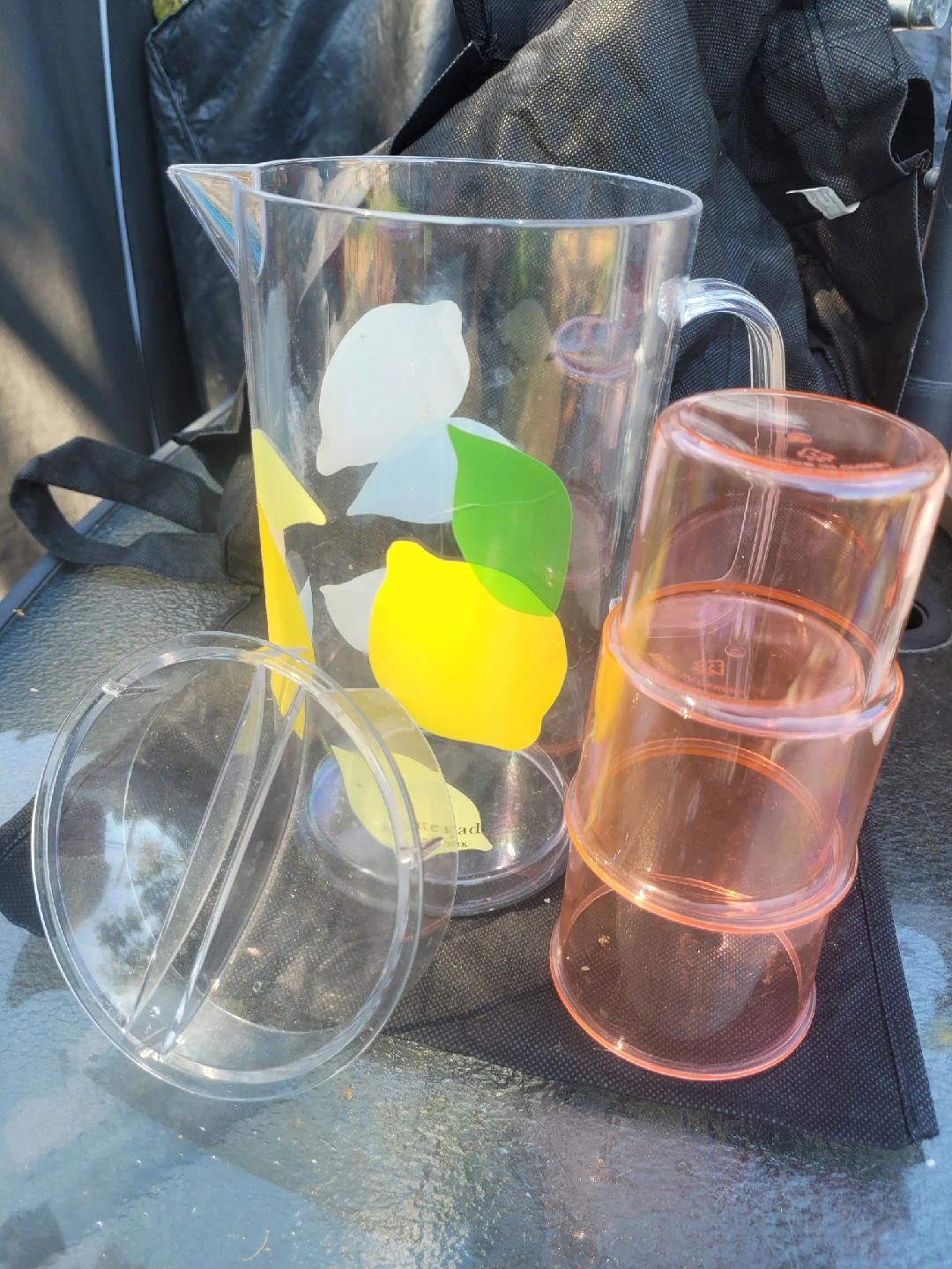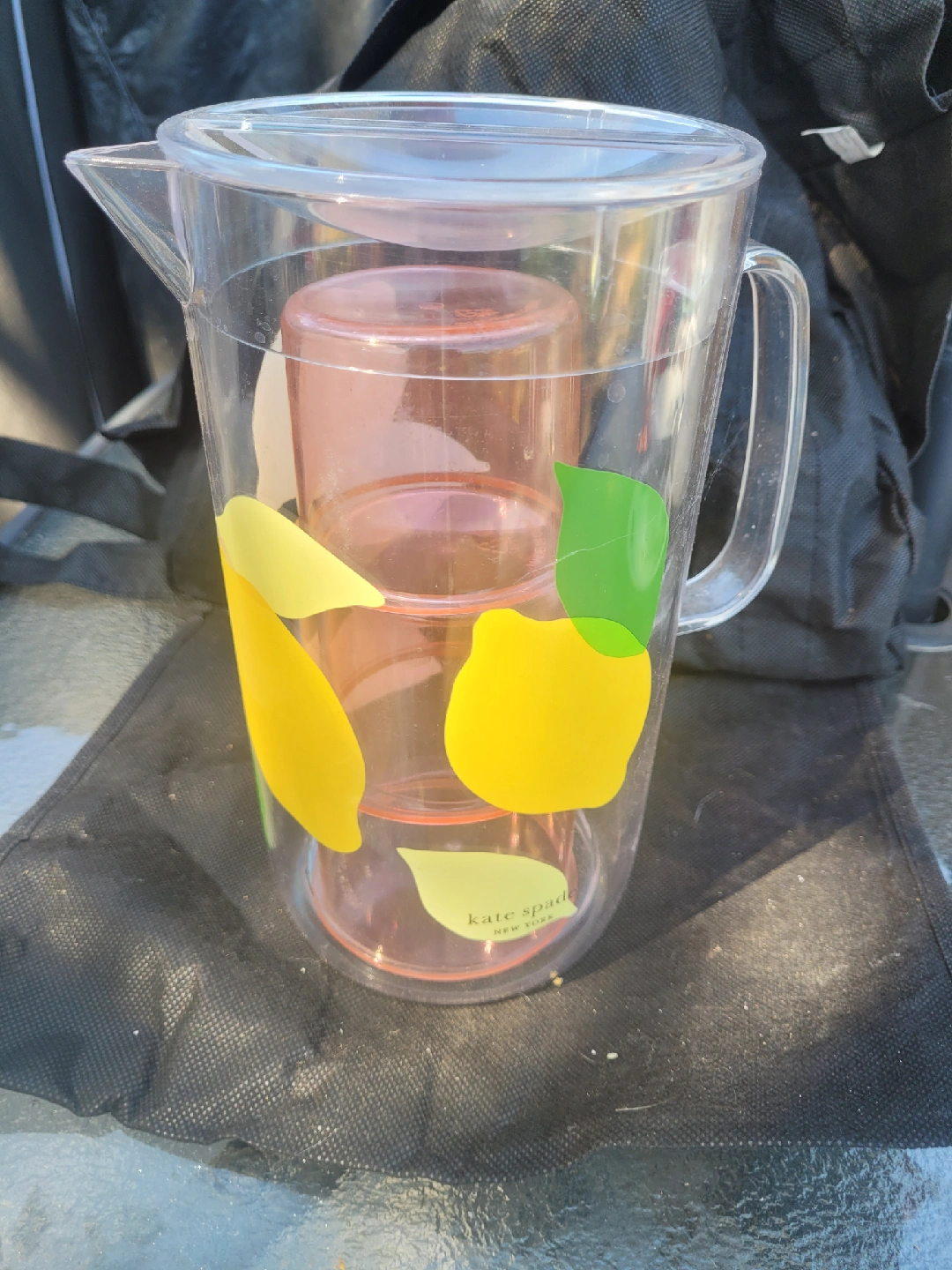 Selling a Kate Spade New York pitcher with a cute lemon design! It comes with matching cups and a lid. Perfect for summer drinks on the patio!