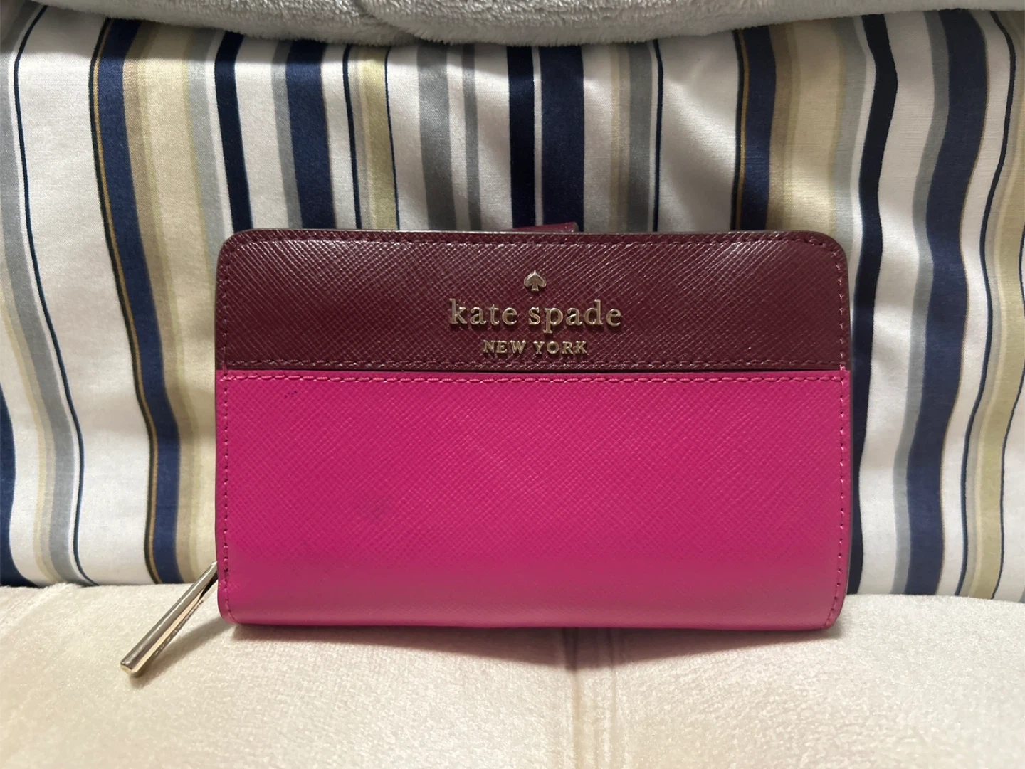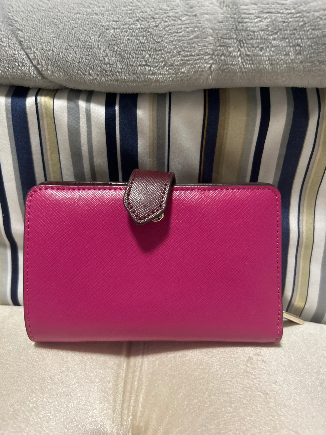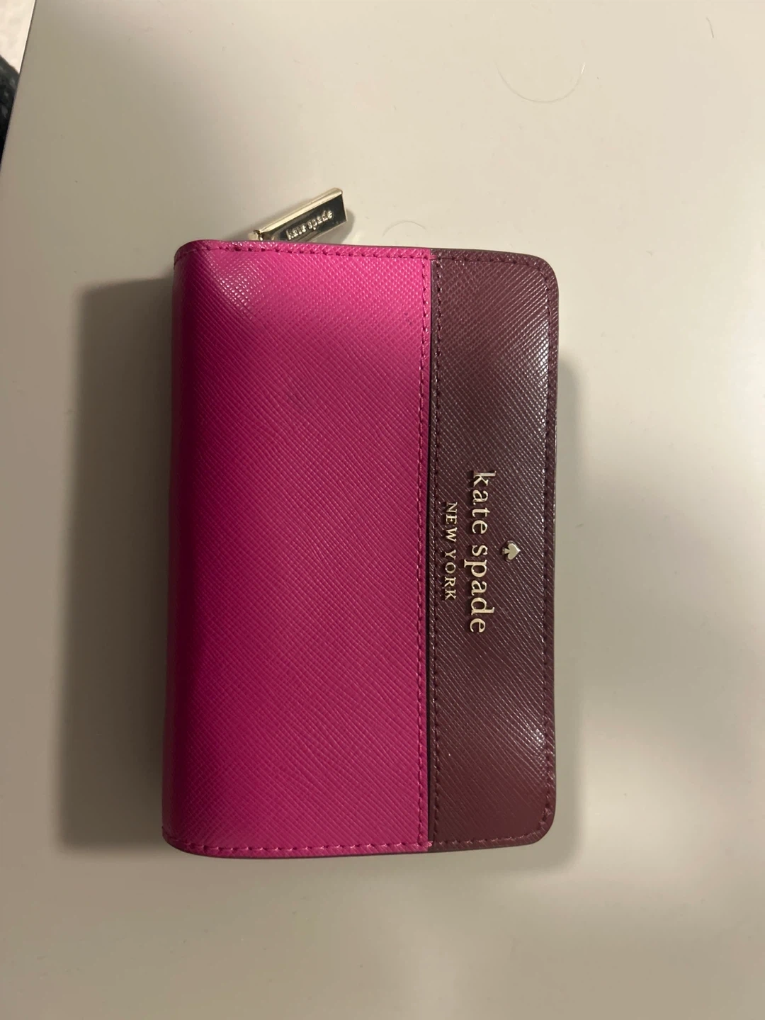 Selling a Kate Spade New York wallet. It features a two-tone design with a dark brownish top and a vibrant pink bottom. Great for organizing your cards and cash! It ’s in great condition