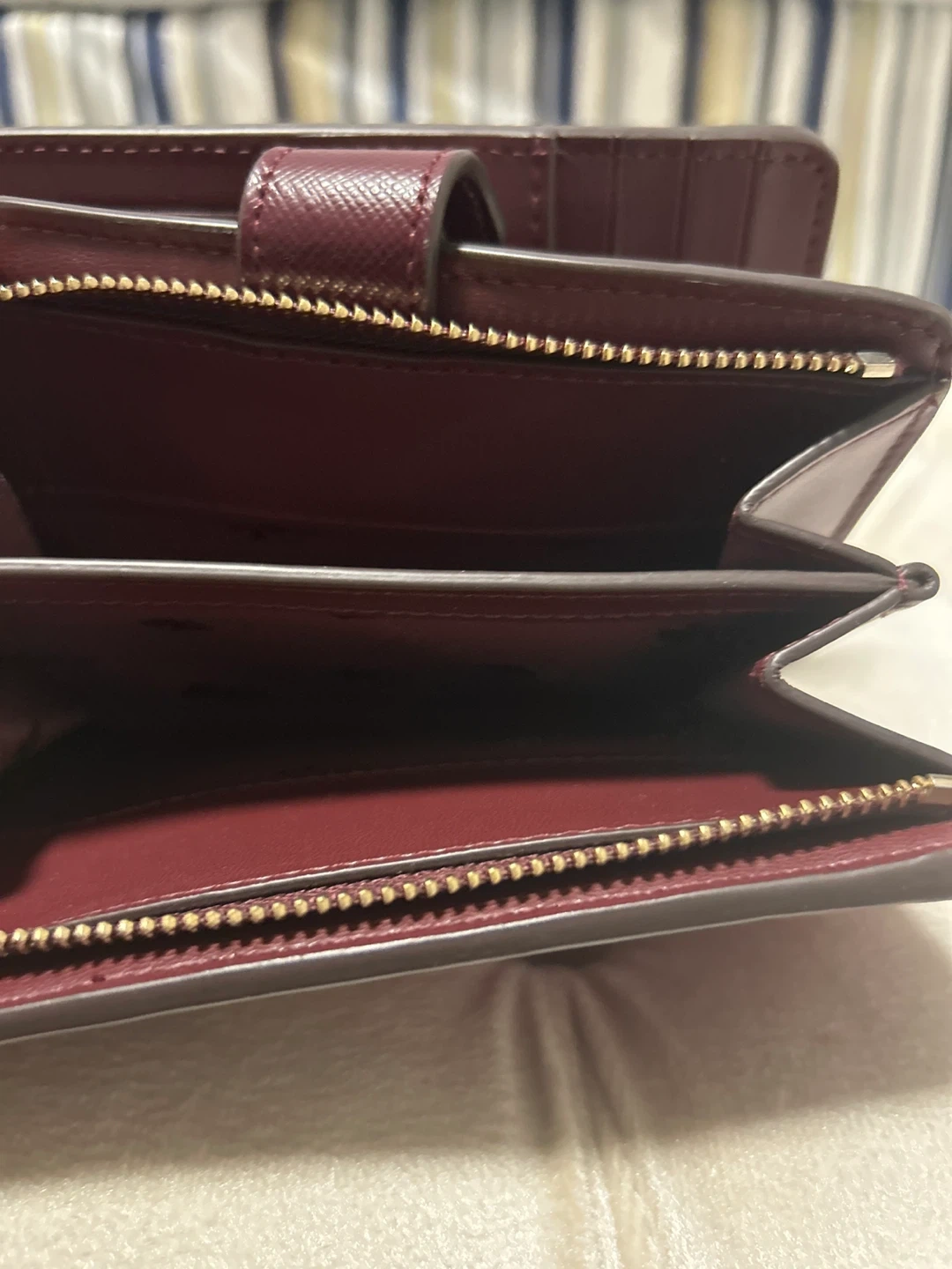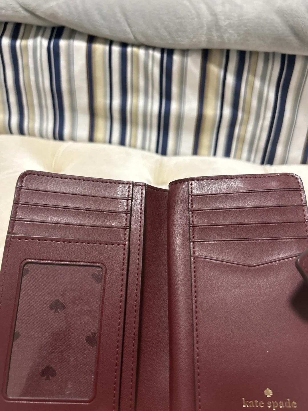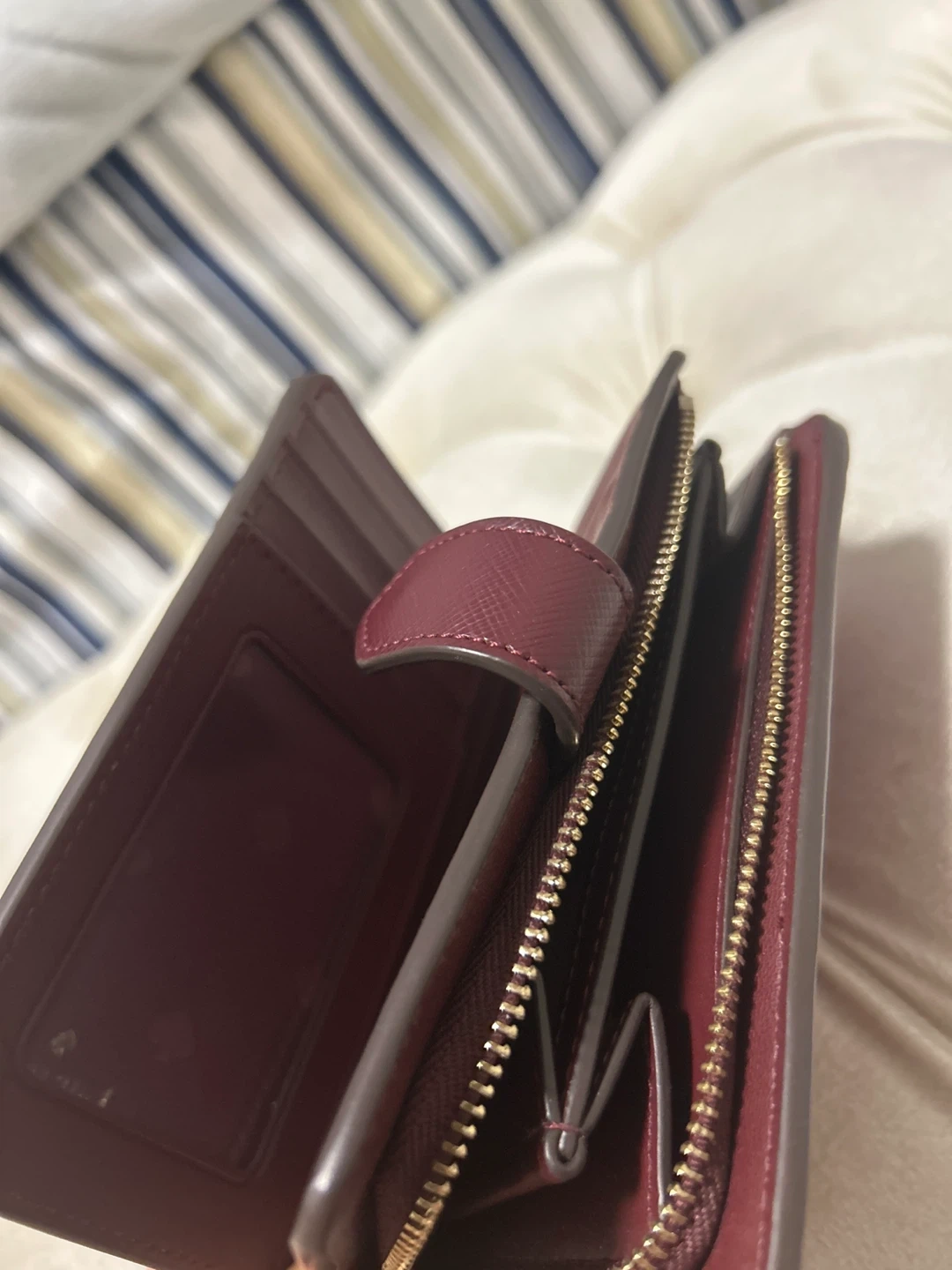 Selling a Kate Spade New York wallet. It features a two-tone design with a dark brownish top and a vibrant pink bottom. Great for organizing your cards and cash! It ’s in great condition