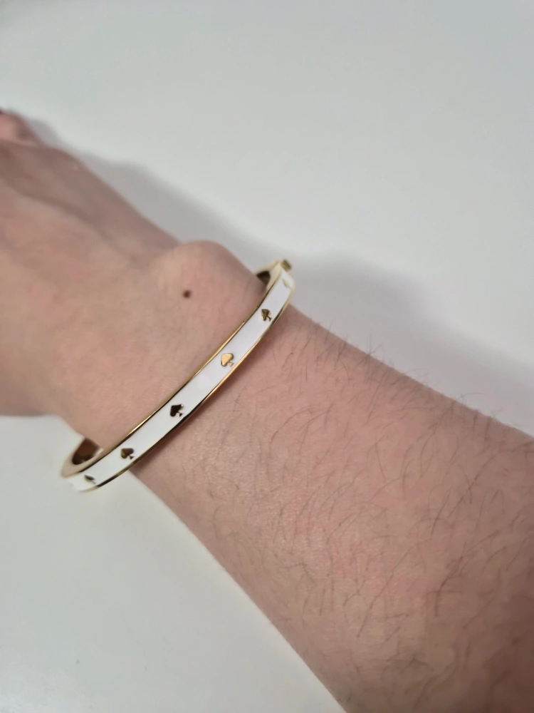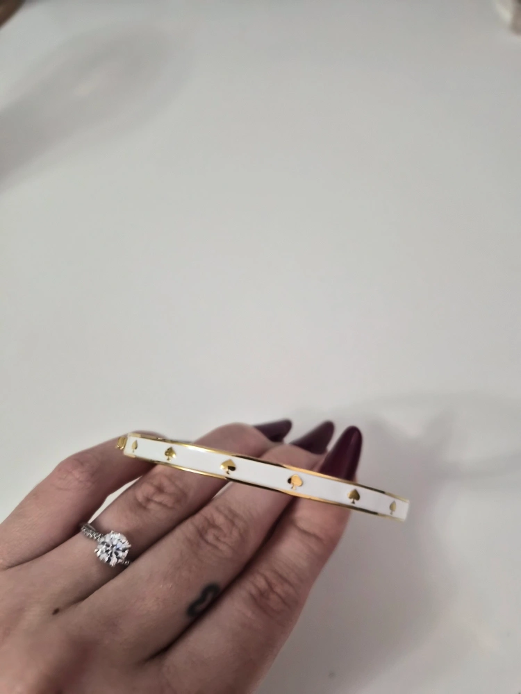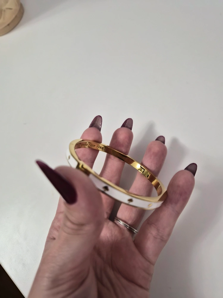 26Selling a cute Kate Spade New York bangle. It's white with gold accents and the spade logo. Perfect for adding a touch of elegance to any outfit!