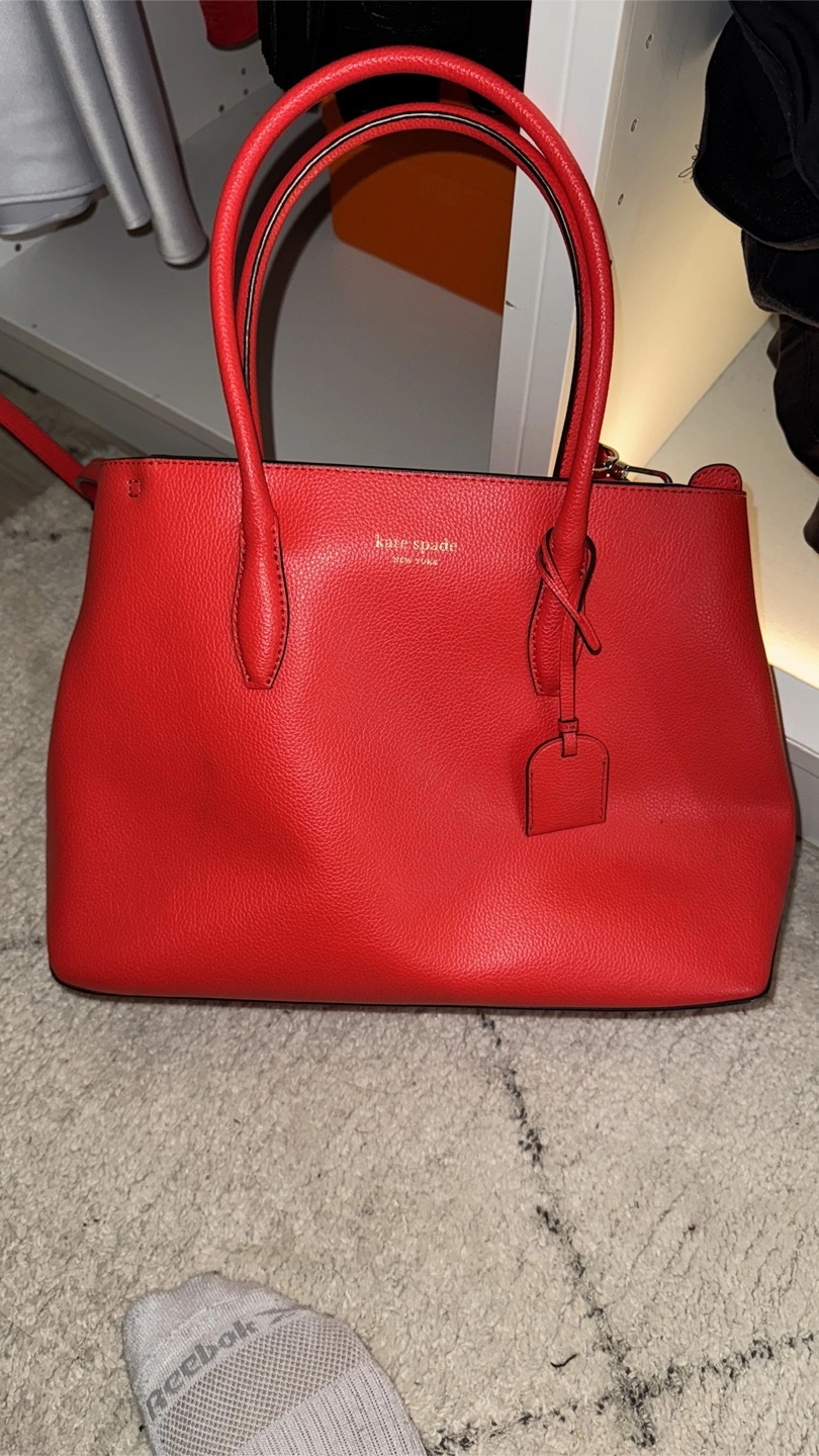 Selling a Kate Spade tote bag in a vibrant red colour. It's made of leather and is in great condition. Perfect for everyday use or as a stylish accessory!