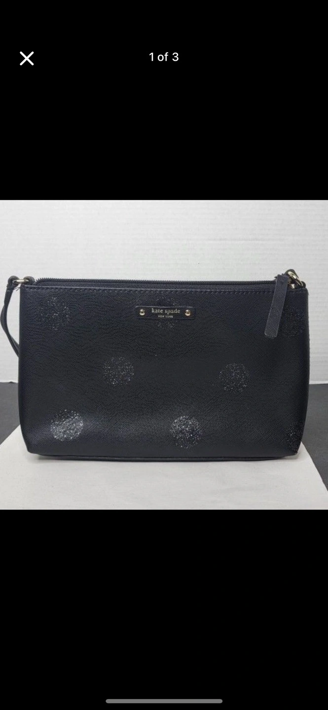 233kate spade "haven lane" black saffiano leather purse with glitter spots original price 200cad + tax https://www.pinkorchard.com/products/kate-spade-haven-lane-ramey-bag-french-navy-glitter-spots perfect condition with the exception of two corners - please see photos.