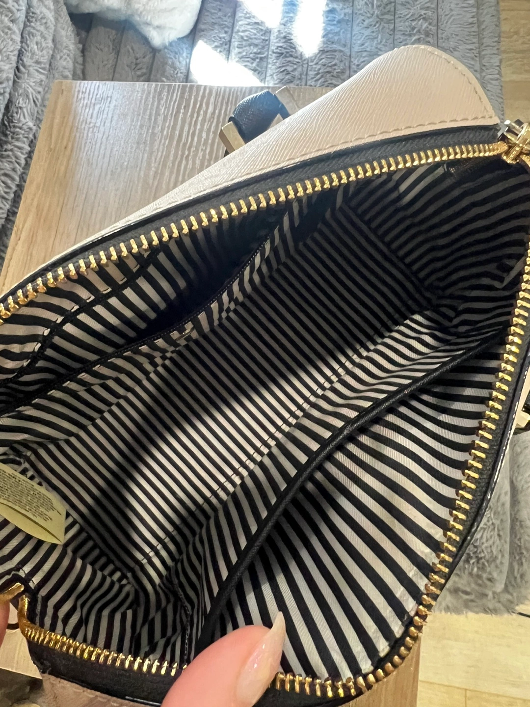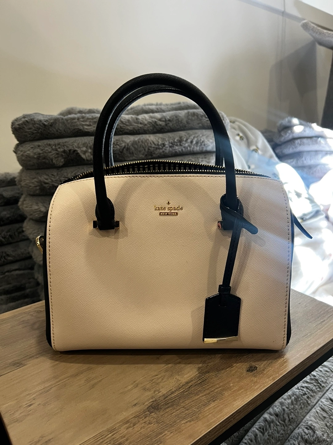Selling a Kate Spade satchel in cream and black. It's in great condition and has a stylish striped lining. Perfect for everyday use!