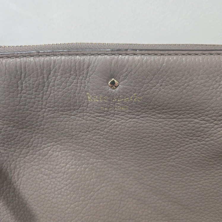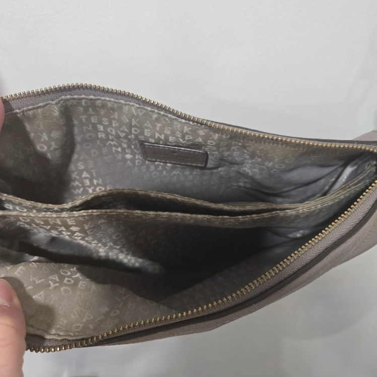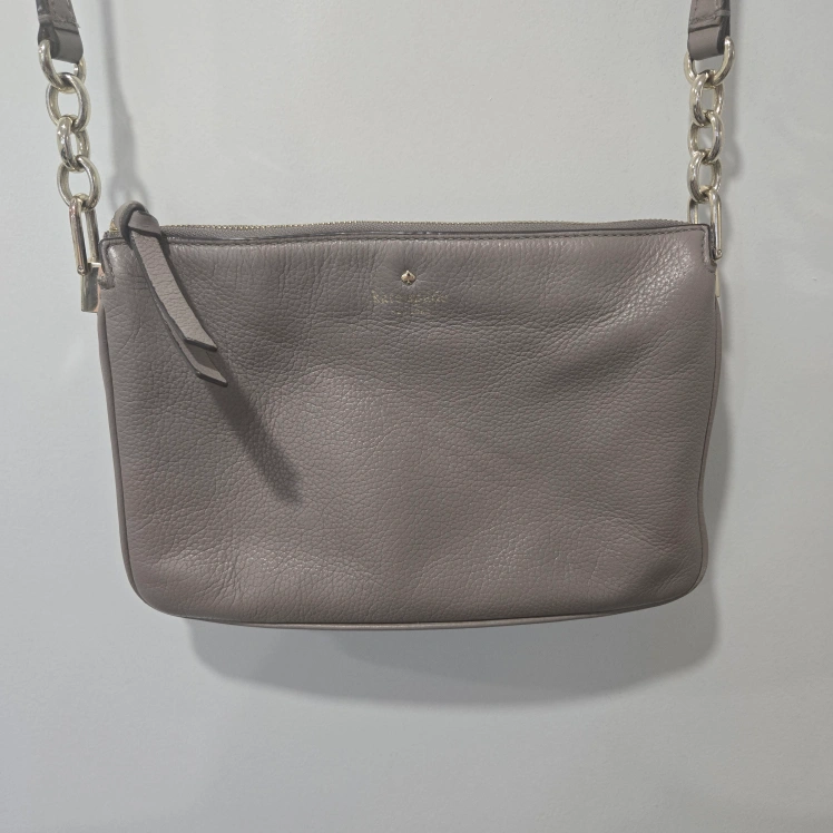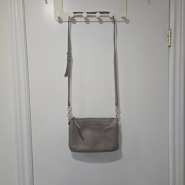 10Kate Spade Taupe Leather Cross Body Purse Grey taupe leather purse. Soft leather. 3 layer pockets. Zips at the top. Long crossbody strap is adjustable. 24cm long, 16cm tall