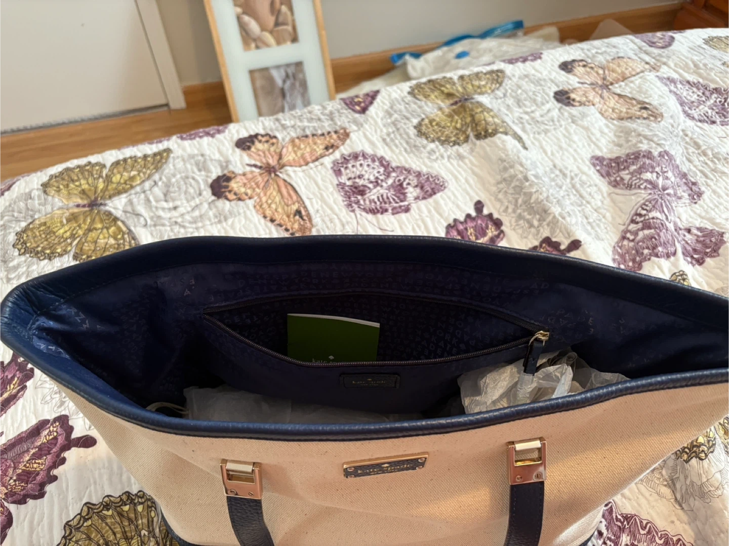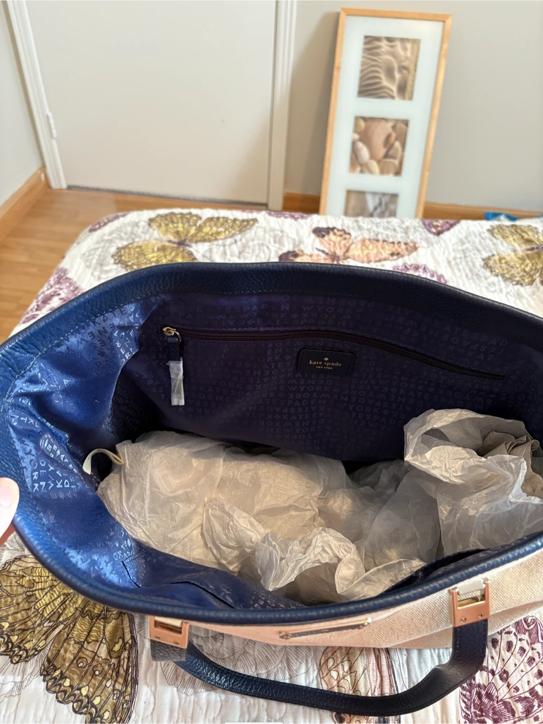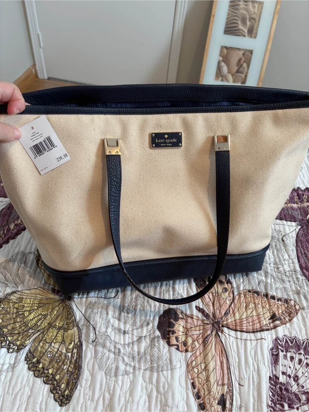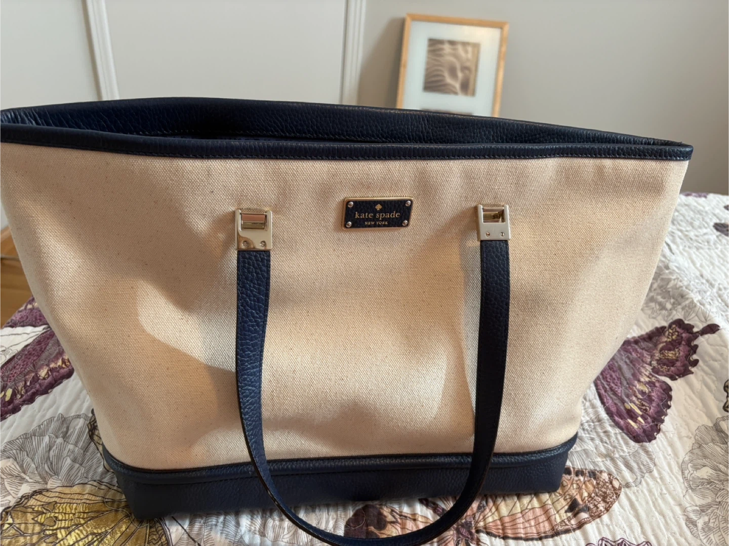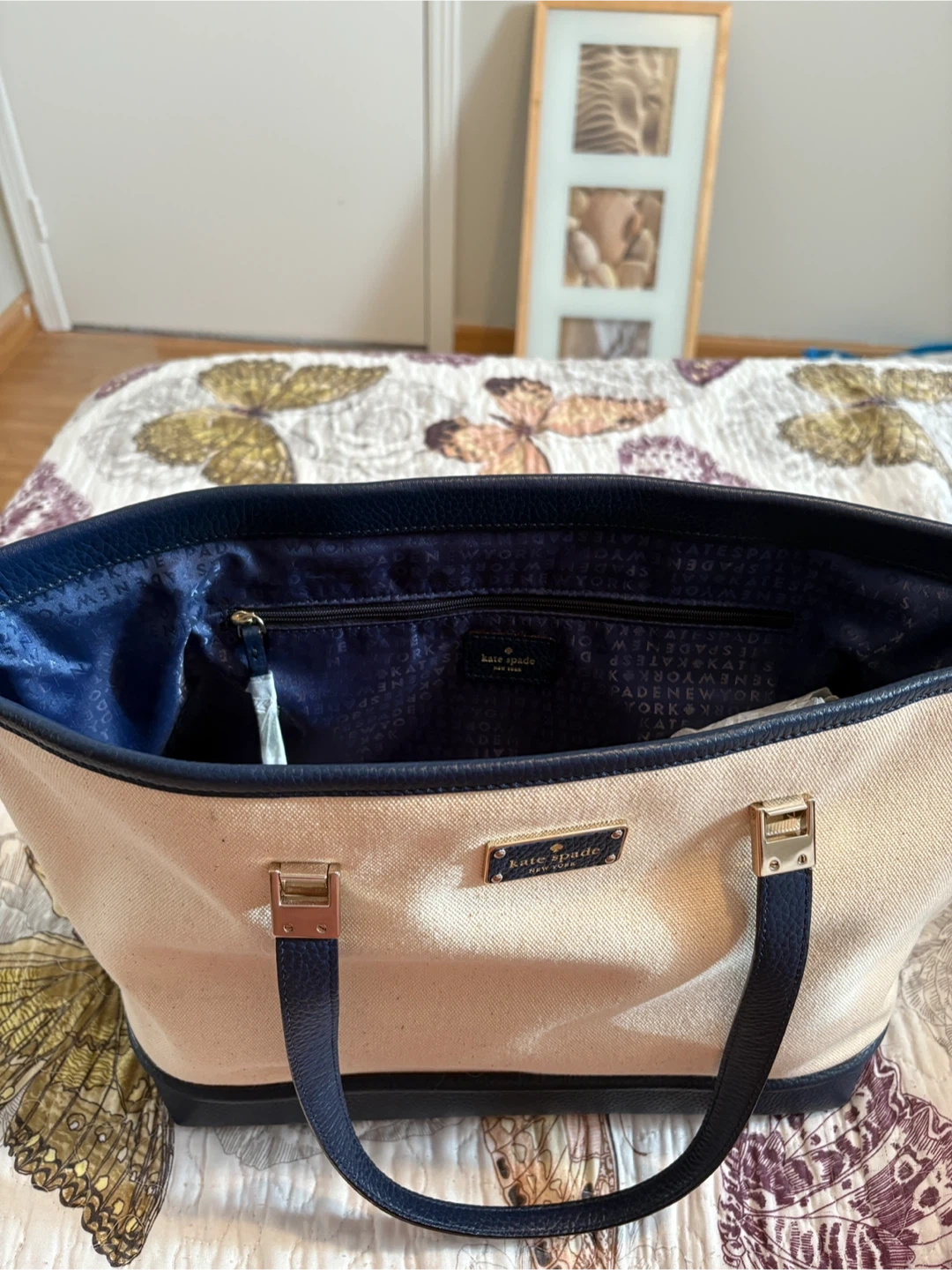 10Selling a Kate Spade tote bag in a lovely beige and navy colour combination! It's in great condition and perfect for everyday use. Originally bought for $239.99