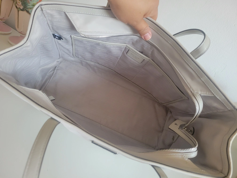 Selling a Kate Spade tote bag in a beautiful light beige colour. It's in great condition and perfect for everyday use. The interior has a zippered pocket for added security. A stylish and practical addition to your wardrobe!