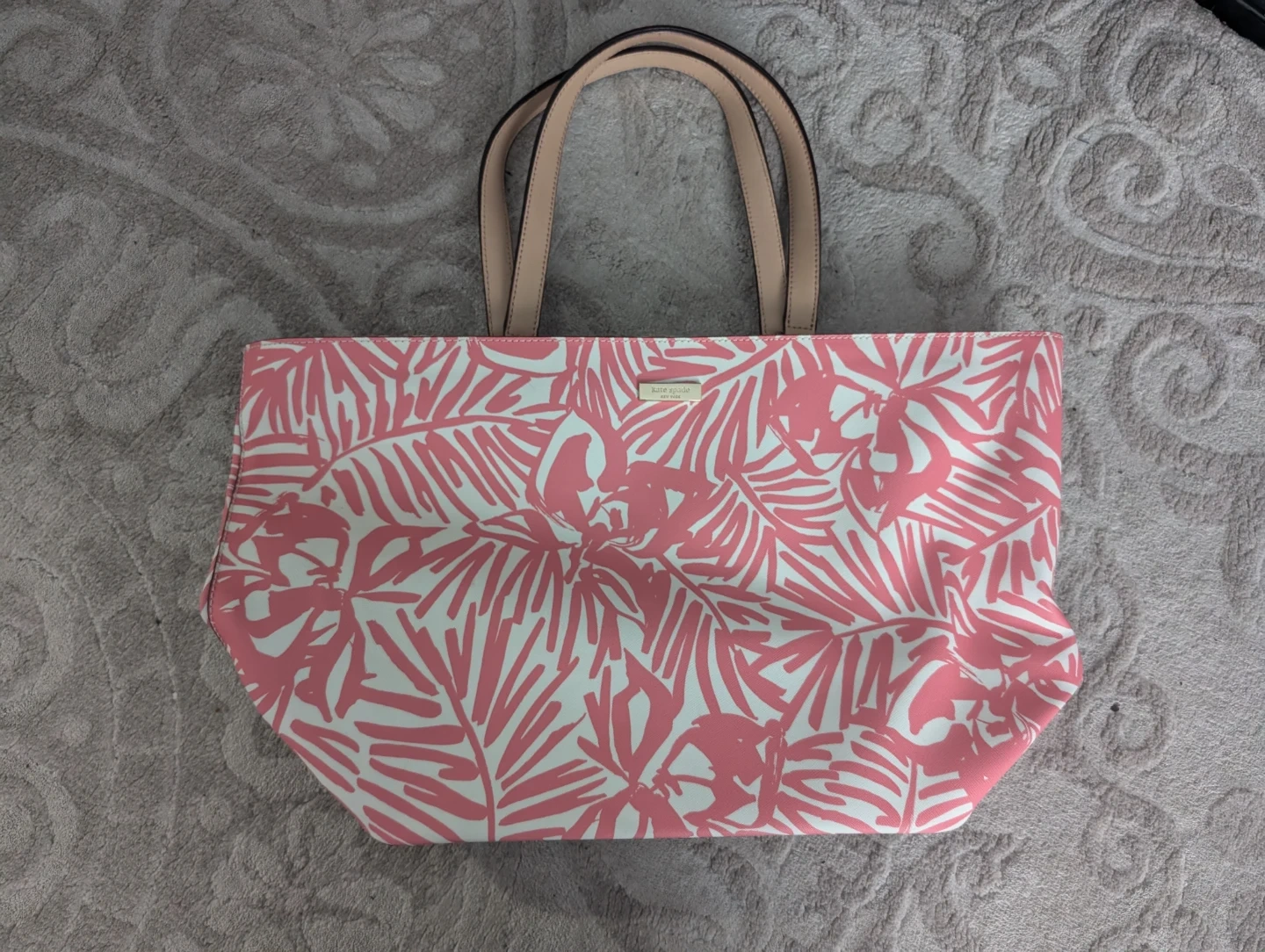26Selling a Kate Spade tote bag with a lovely pink and white floral pattern! It's in great condition and perfect for everyday use. The bag has comfortable handles and is a stylish way to carry your belongings.