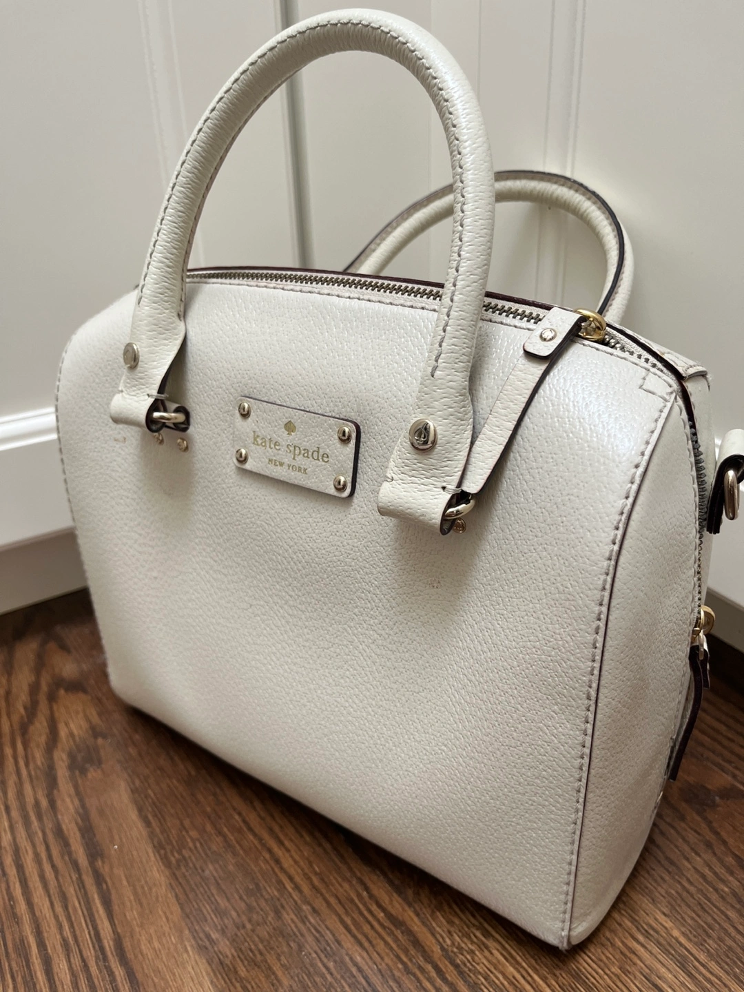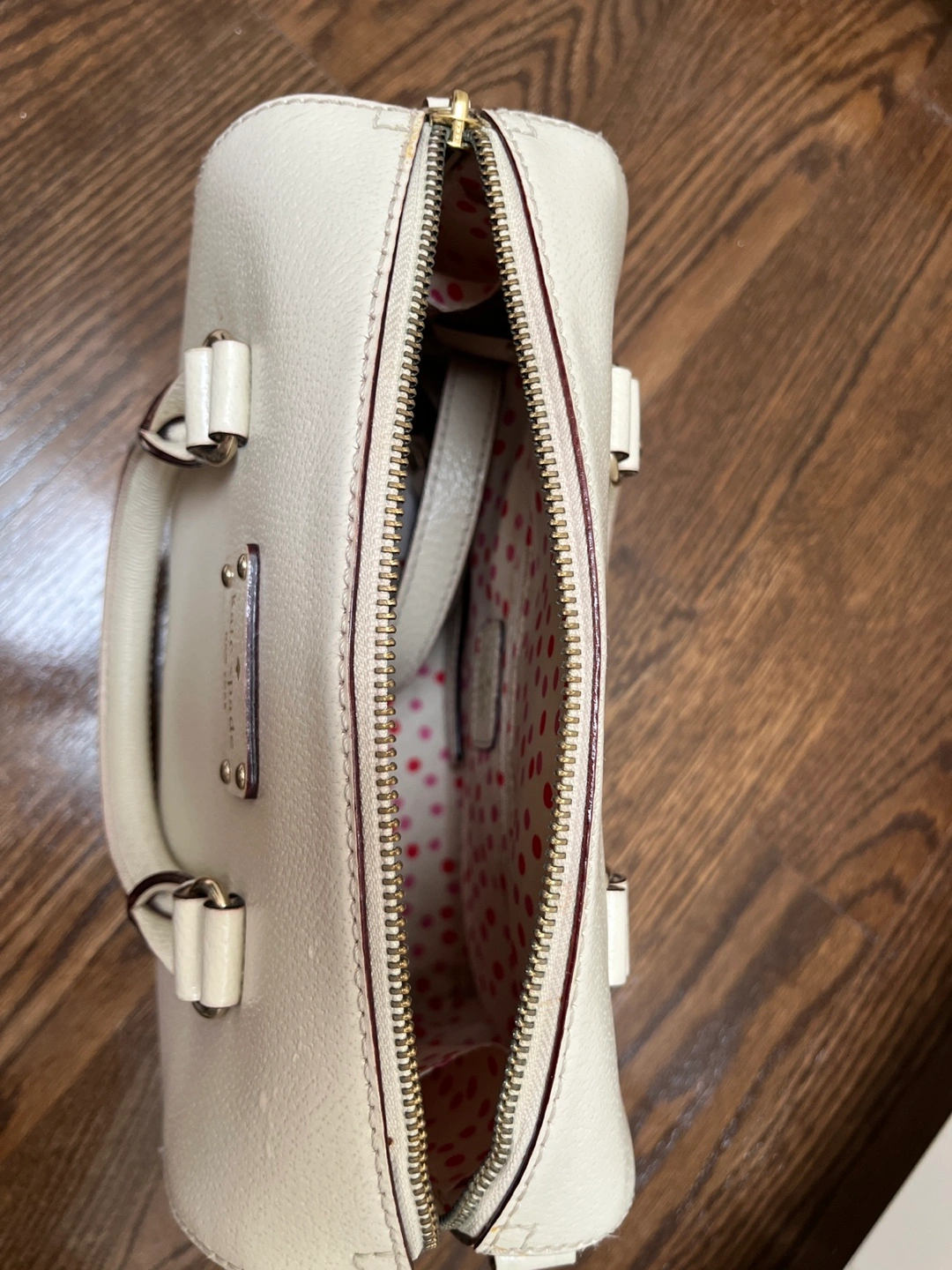 Selling a cute Kate Spade satchel! It's a lovely white colour and made of leather. The interior has a fun pink and red polka dot pattern. It's in great condition and perfect for everyday use!