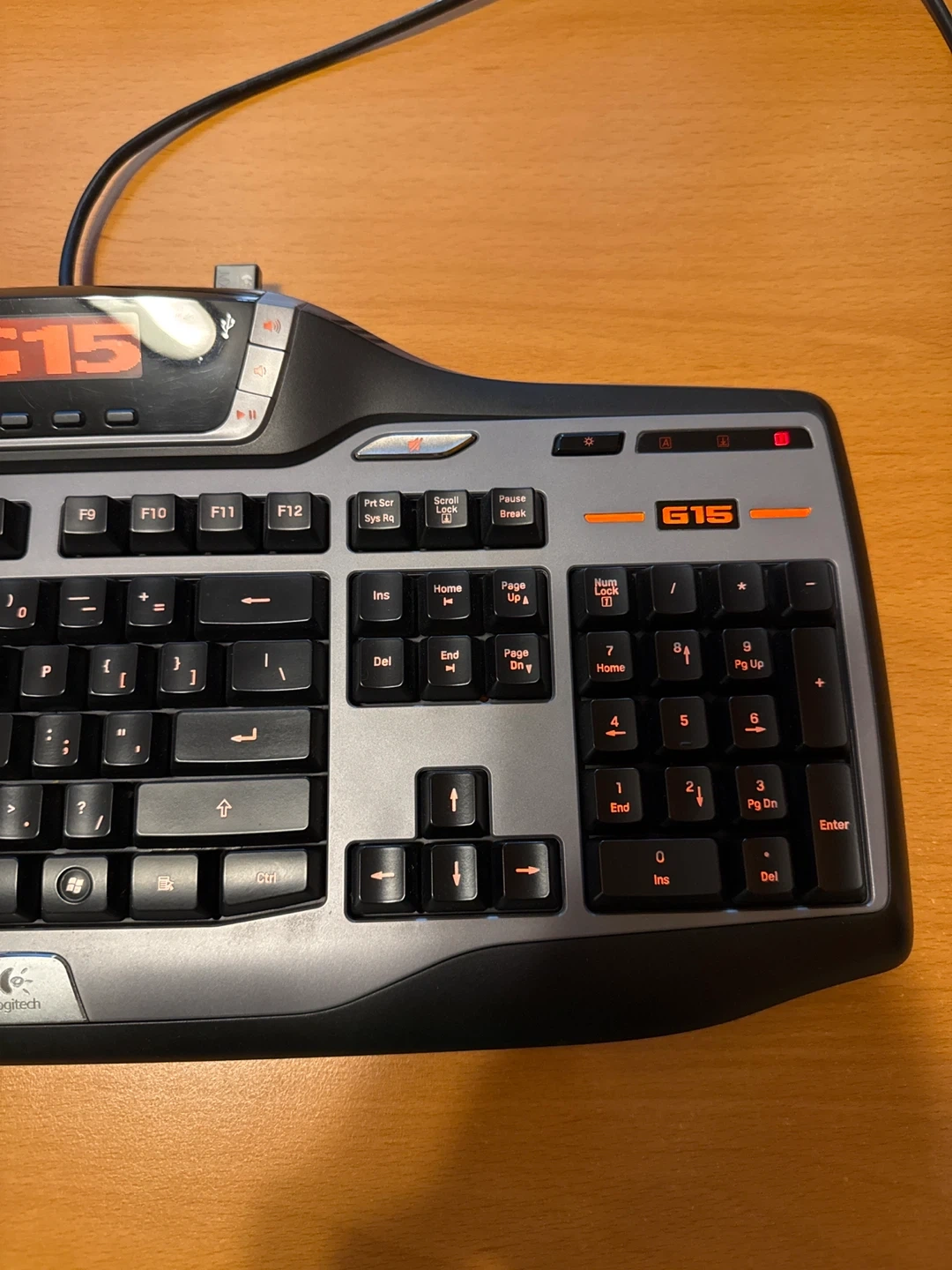 This is a Logitech G15 gaming keyboard in excellent condition. It has programmable G-keys for in-game macros. The screen displays game info and system stats. Backlit keys are orange.