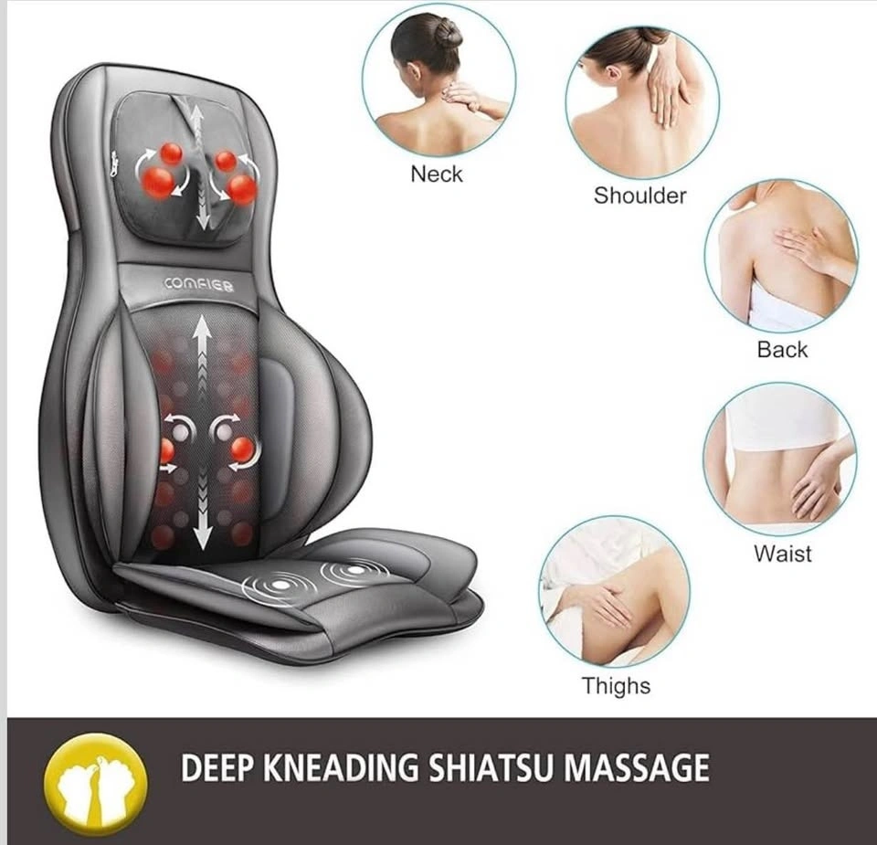 Brand new Comfier full body massage chair pad designed to provide relaxing shiatsu kneading massage for your neck, shoulders, and entire back. Includes soothing heat function and adjustable massage settings to help relieve muscle tension and stress. Portable design fits most office chairs, recliners, and home chairs, making it great for daily relaxation or as a thoughtful gift.
