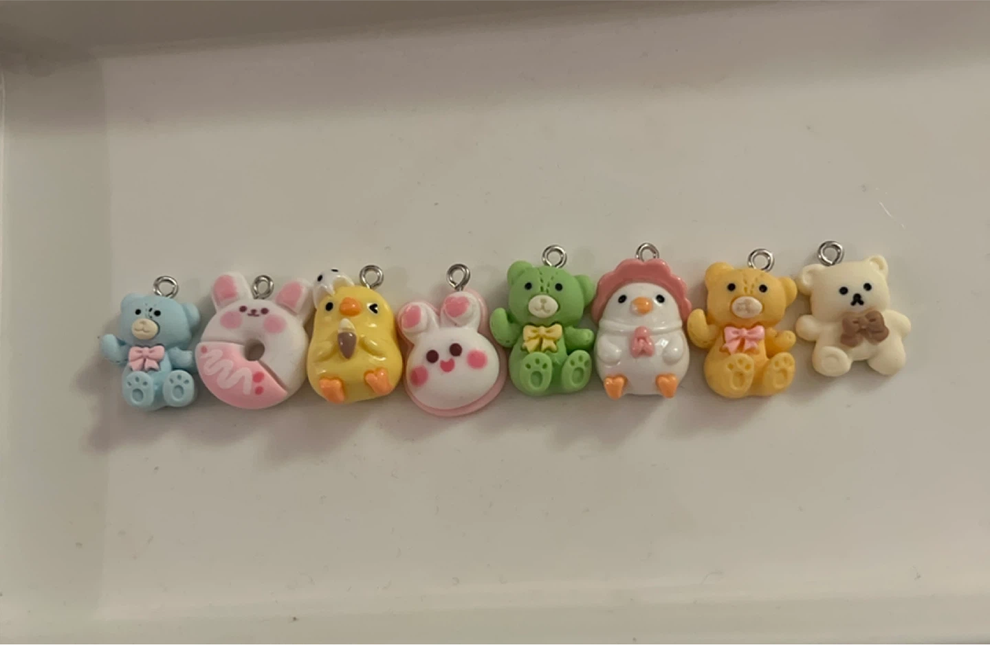 5Selling a collection of adorable animal charms! These include a blue bear, a donut bunny, a chick, a bunny macaron, a green bear, a snow chick, a yellow bear, and a white bear. Perfect for adding a touch of cuteness to your accessories or crafts