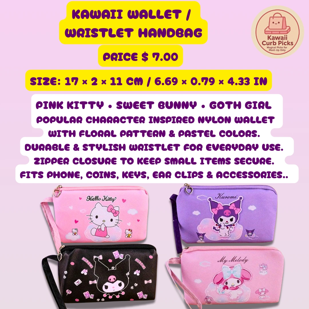 Check out this adorable kawaii wallet/wristlet handbag! It's a Hello Kitty and Friends inspired nylon wallet with a floral pattern and pastel colours. It's durable and stylish for everyday use, with a zipper closure to keep your small items secure. It can fit your phone, coins, keys, ear clips, and other accessories. Size: 17 x 2 x 11 CM / 6.69 x 0.79 x 4.33 IN ONLY AVAILABLE FOR PICK UP OR MEET UP IN DURHAM CENTER AJAX. ALL ITEMS ARE HELLO KITTY AND FRIENDS CHARACTER INSPIRED.