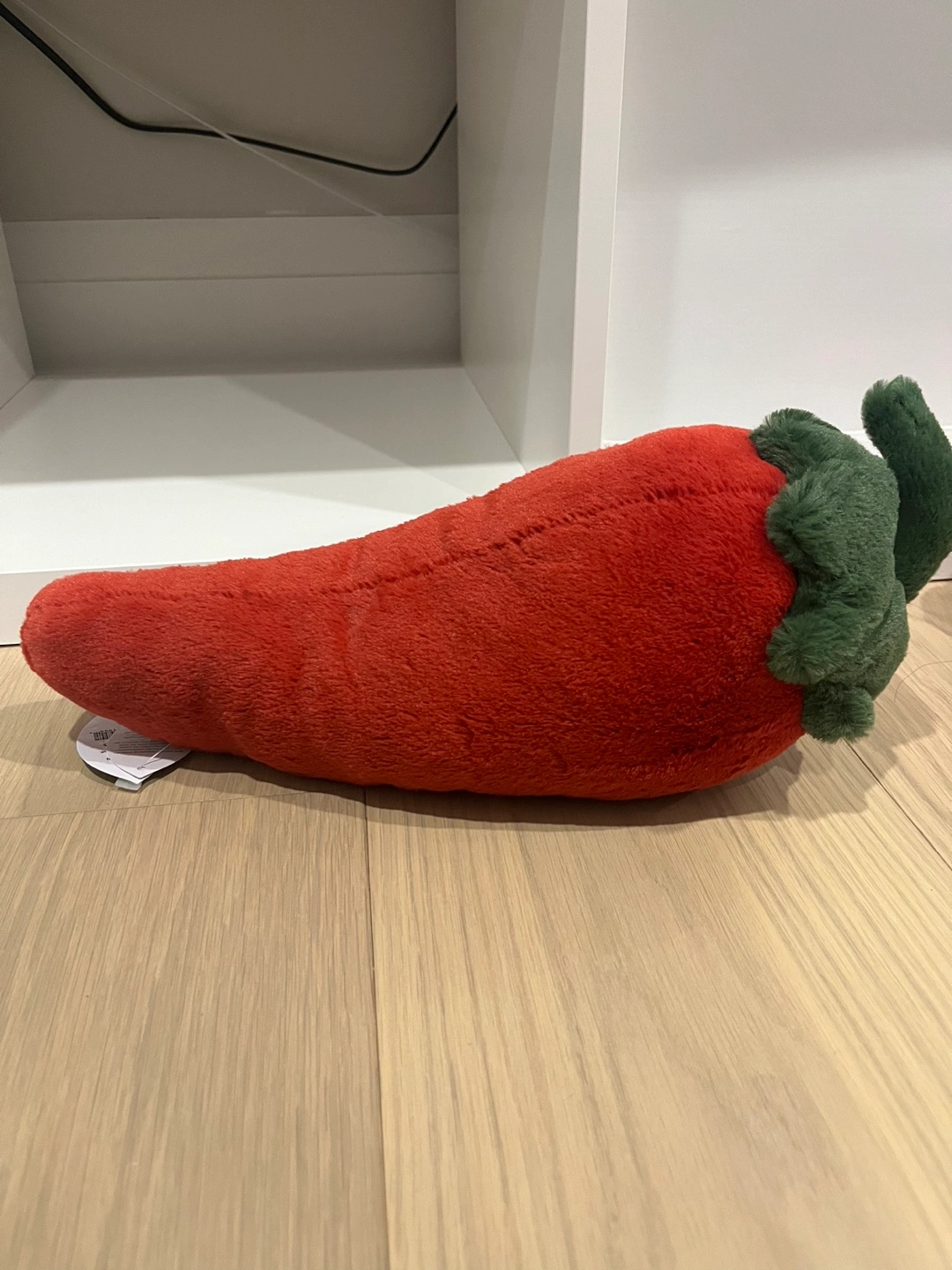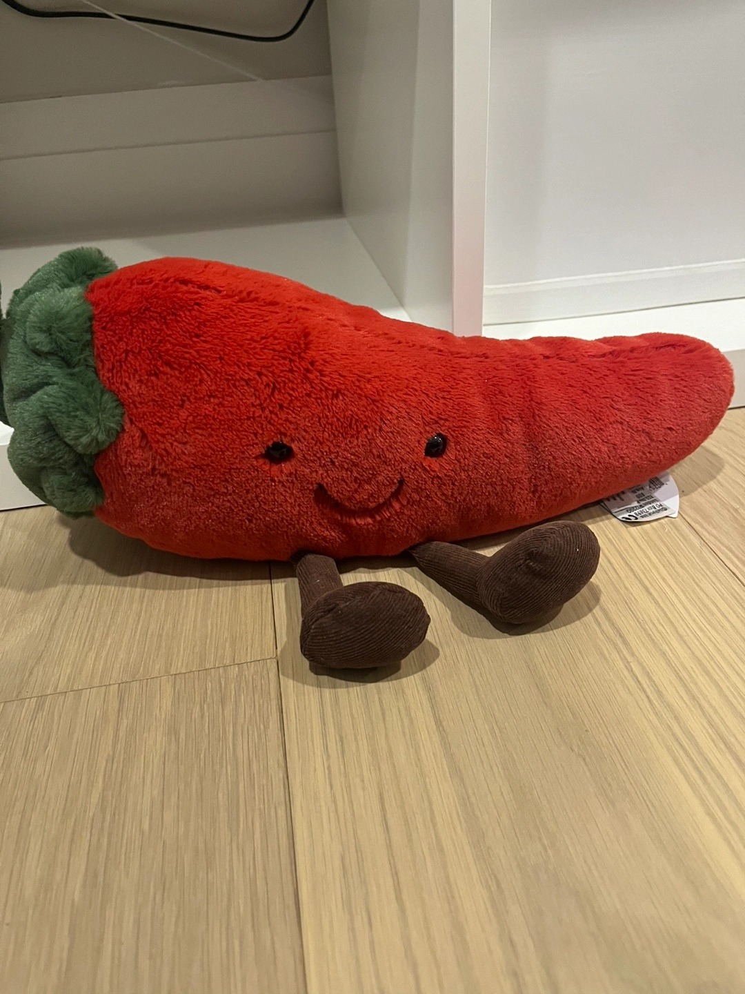 Retired jellycat. Soft and cuddly chili pepper plush toy. Red body, green stem, and brown corduroy legs. Perfect for children or collectors. Gently used.