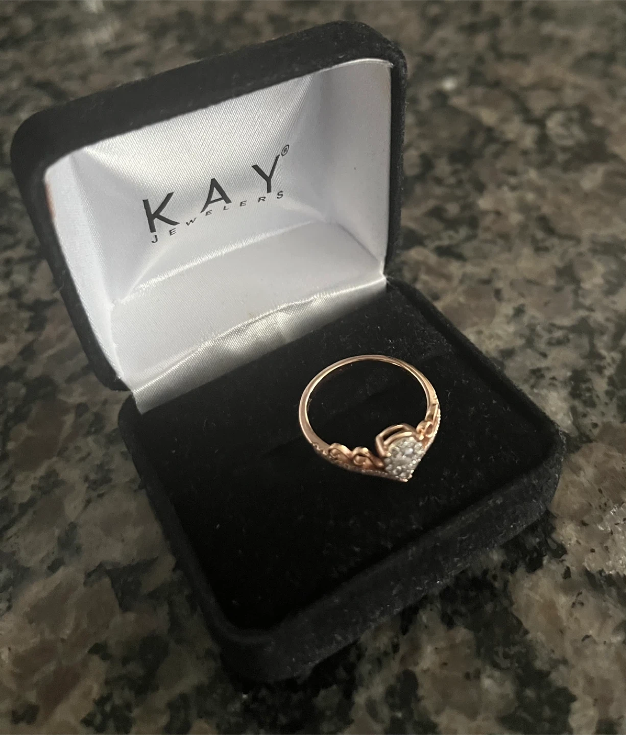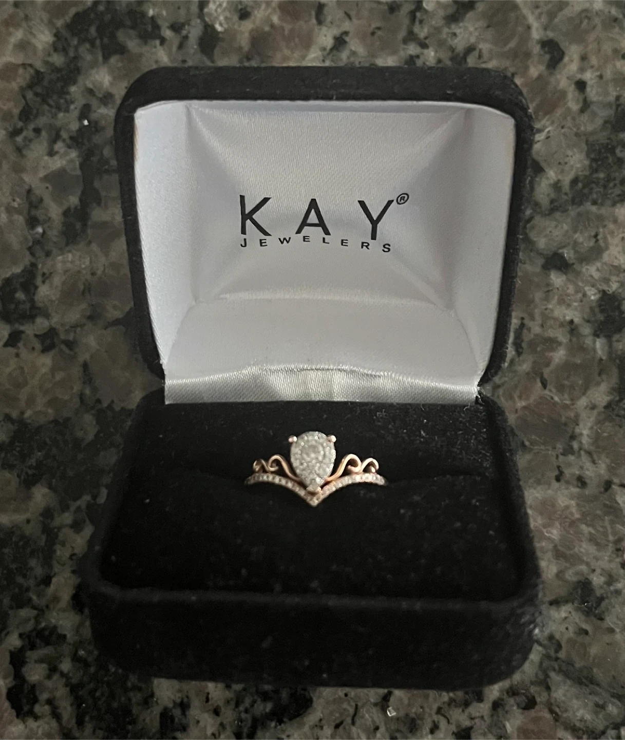 Selling a beautiful rose gold ring from Kay Jewelers. It comes in its original box, perfect for gifting or keeping it safe. The ring features a unique design that would look lovely on anyone!