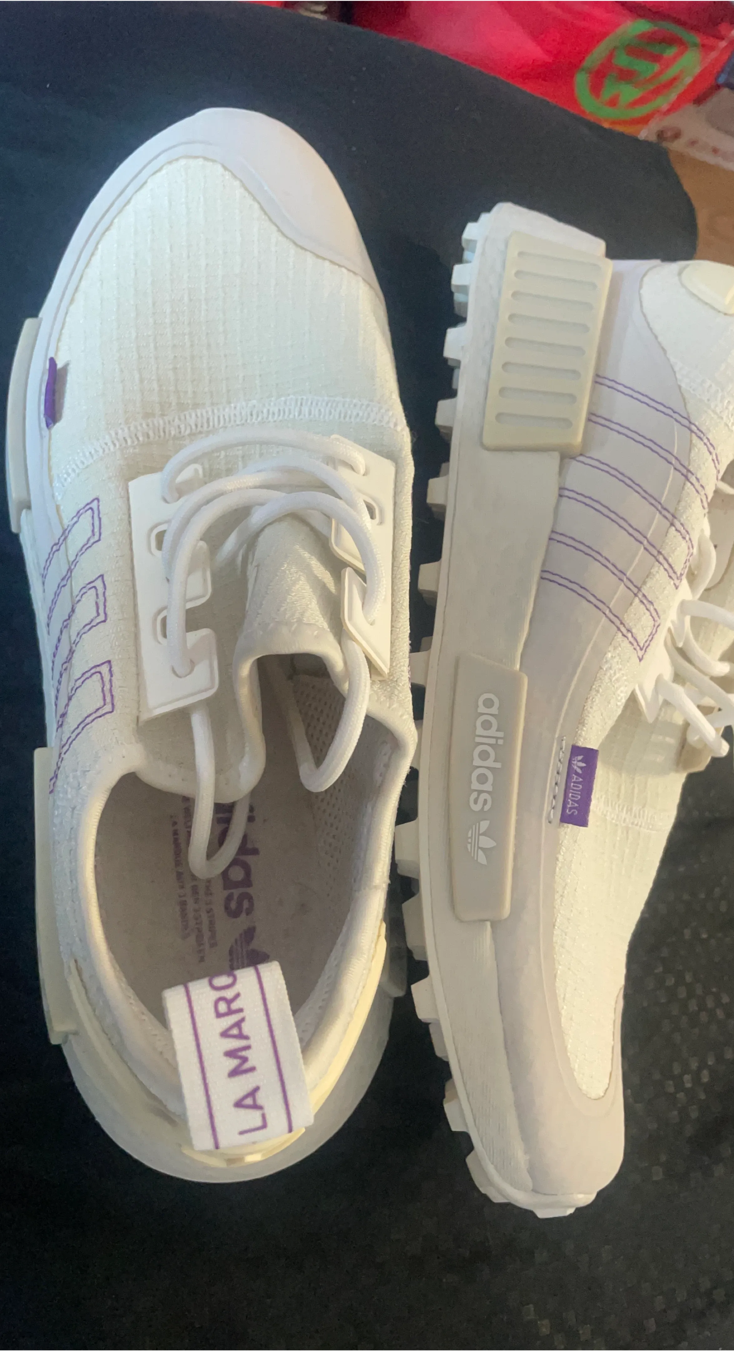 White Adidas NMD R1 sneakers with purple accents. Textile upper and rubber outsole. Lace-up closure. "La Marque Aux 3 Bandes" detail on the tongue.