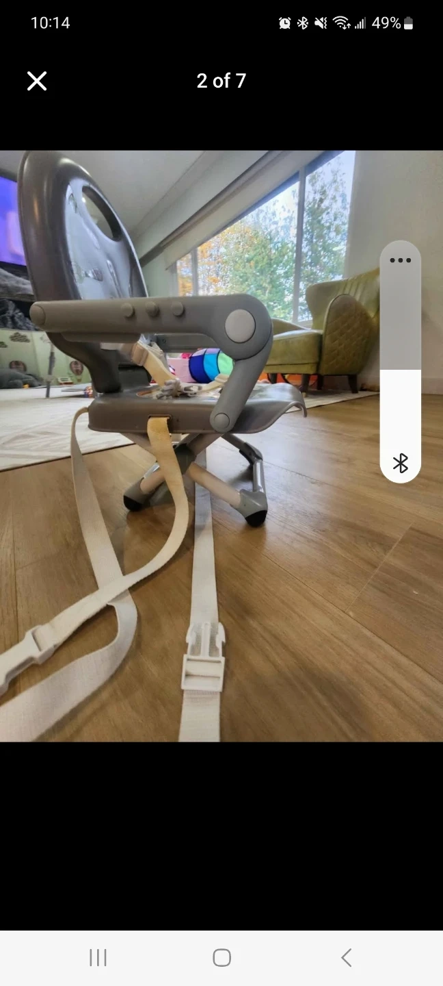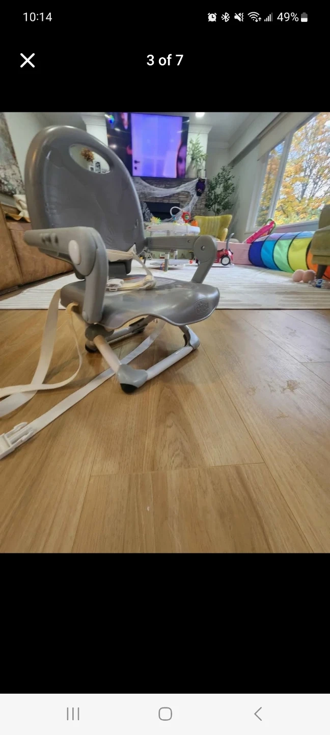 Grey Chicco portable high chair with removable tray. It has adjustable straps for securing to a chair. Easy to clean and convenient for travel!
