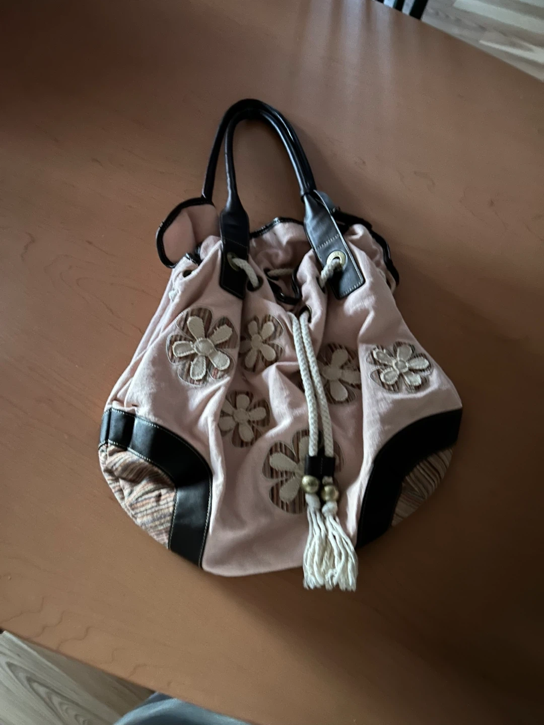 A stylish beige shoulder bag featuring dark brown faux leather accents and decorative floral appliqués. It has a convenient drawstring closure and a braided tassel detail. This bag is perfect for everyday use or for adding a touch of flair to an outfit.