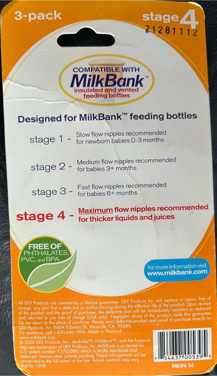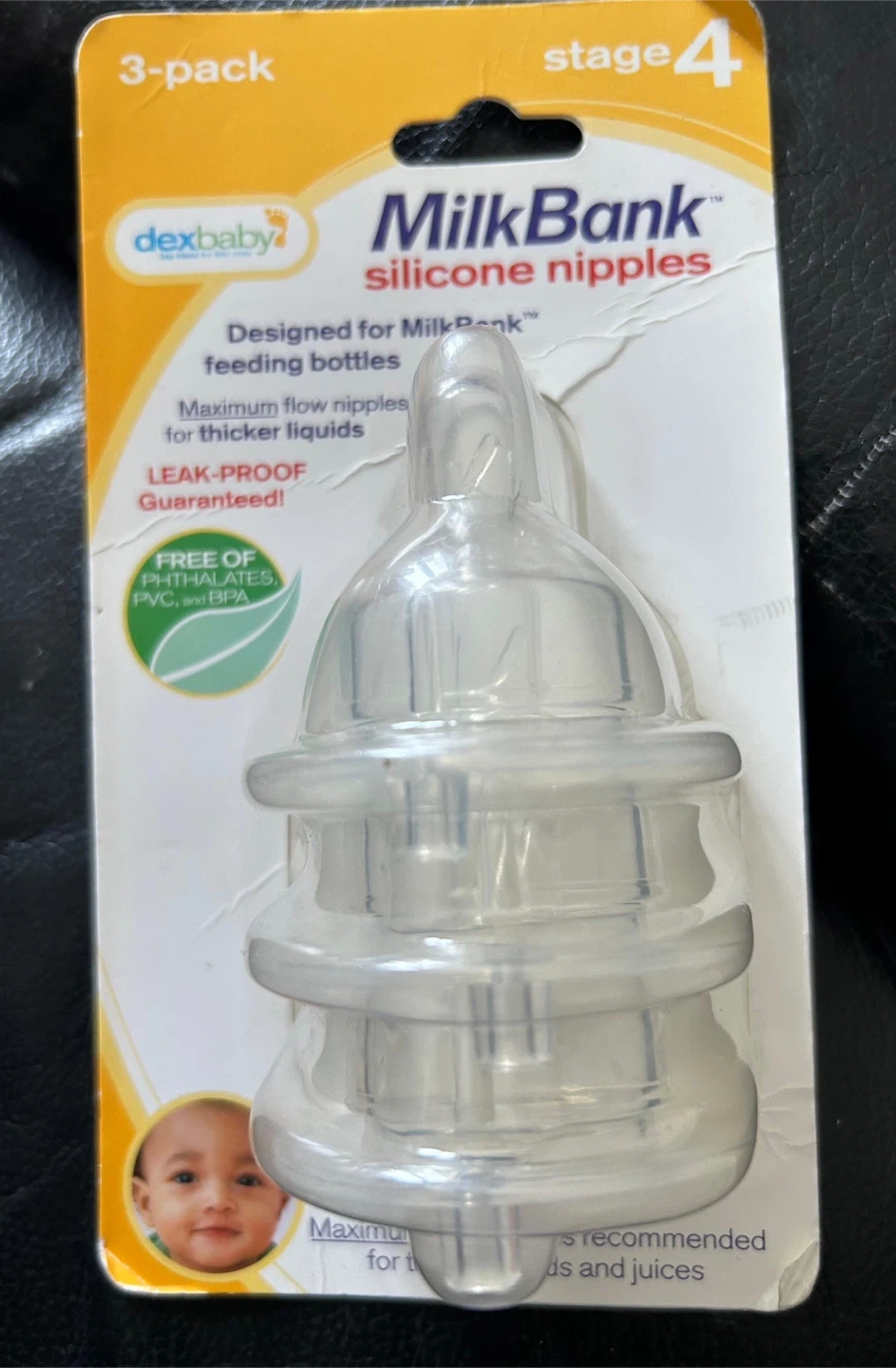 This is a 3-pack of MilkBank Stage 4 silicone nipples. They're maximum flow nipples recommended for thicker liquids and juices. They're compatible with MilkBank feeding bottles and are free of phthalates, PVC, and BPA.