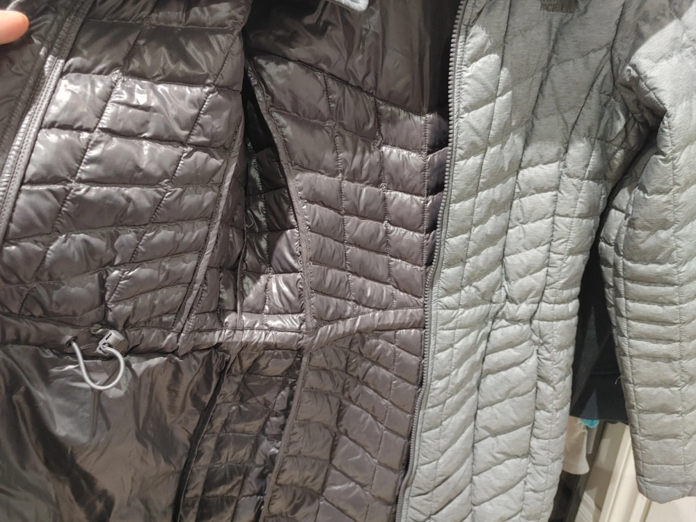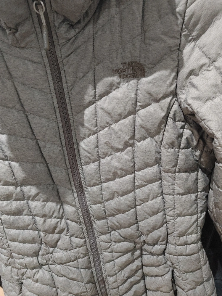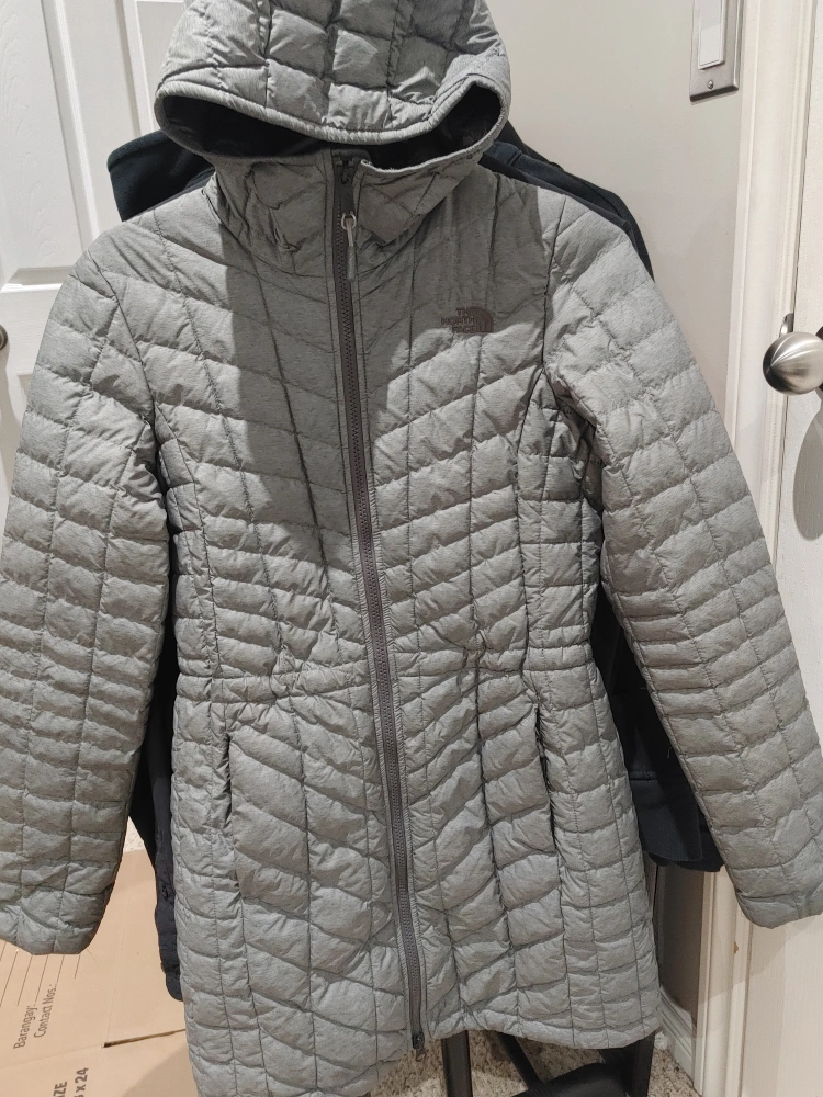 Grey, long-sleeved, hooded jacket with a zipper closure.