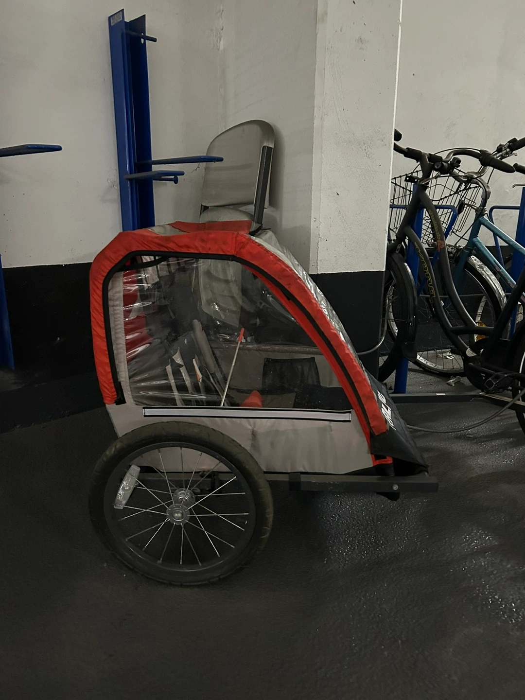 This Raleigh bike trailer is great for hauling your gear or kids. It's red and grey with a clear cover. It's a bit dirty but otherwise in good shape. It attaches to your bike for easy transport.