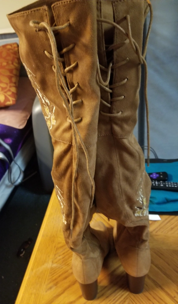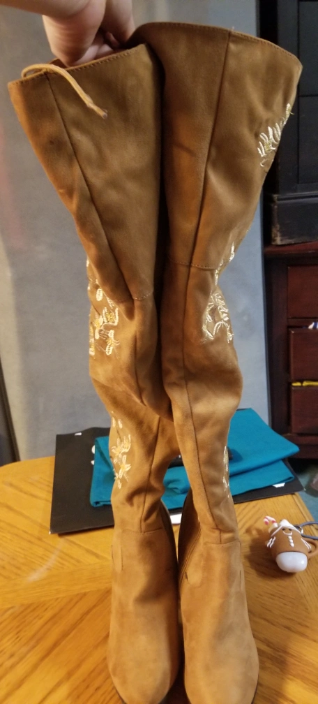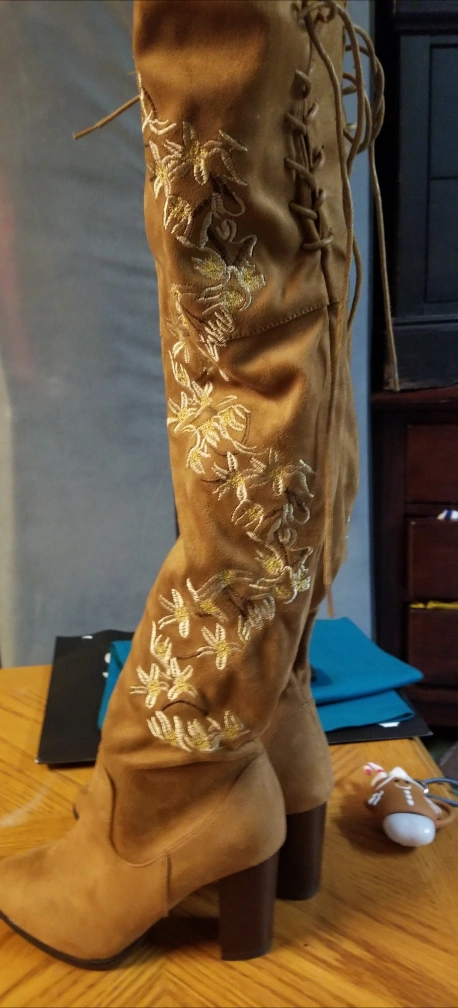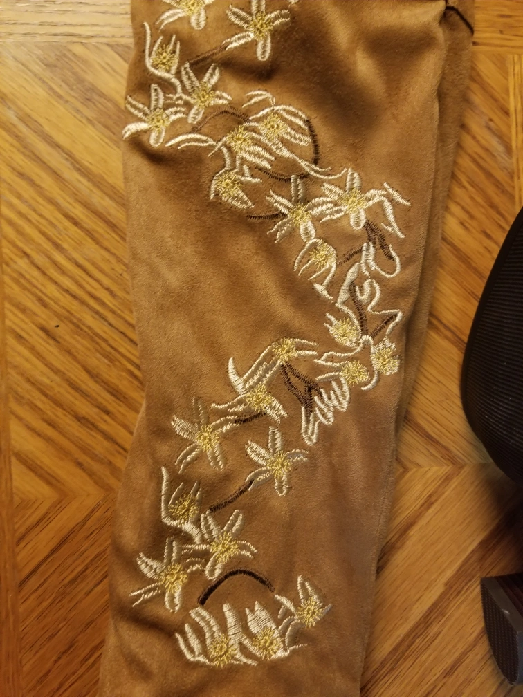 knee-high boots, velvet material with embroidered flowers.