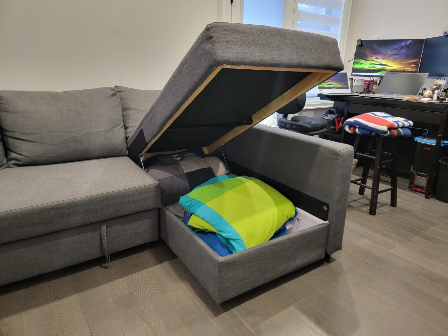 This IKEA FRIHETEN grey sectional sofa features ample under-seat storage, perfect for stowing away blankets and pillows. It easily converts into a pull-out bed for guests. The fabric is a durable grey weave. Couch's short end can be flipped to the other side!