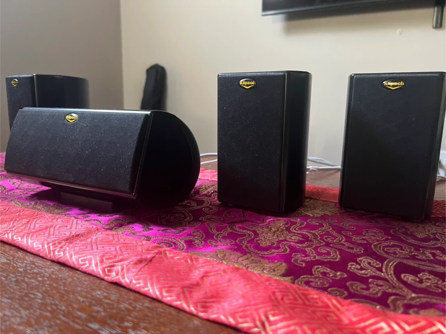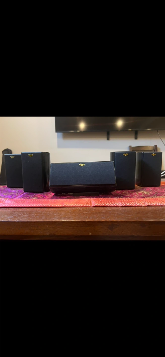 Klipsch 5.1 speaker system in black. Includes center channel and four satellite speakers. These are great for a surround sound setup!