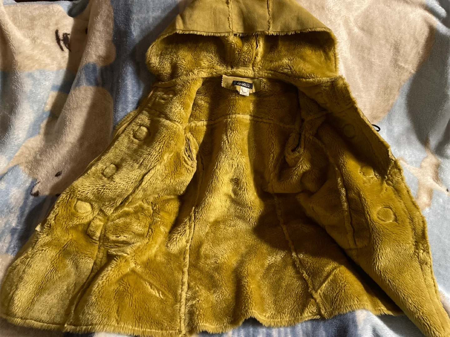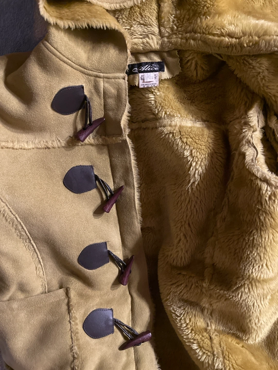 This is a tan, hooded duffle coat with a faux shearling lining. It features toggle closures and faux fur trim on the cuffs and hood. It's a stylish choice for cooler weather!