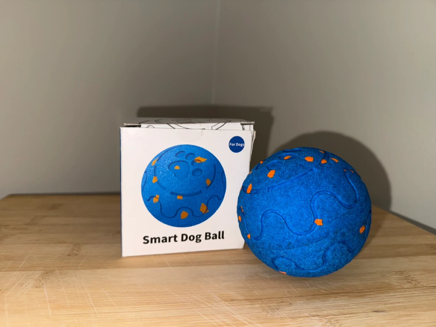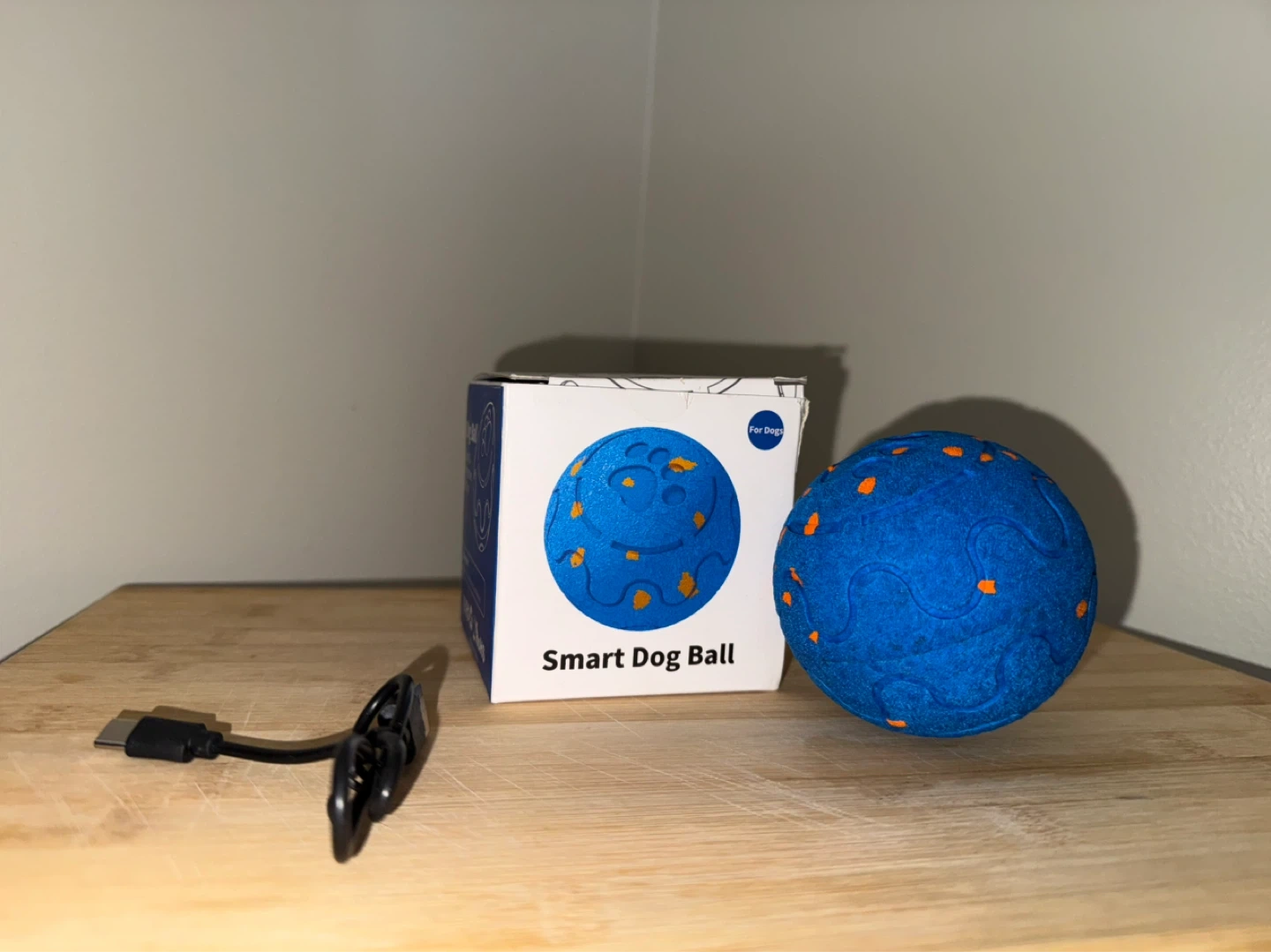This is a smart dog ball designed for interactive play. It's blue with orange accents and comes with a USB charging cable. The ball is made of durable material for long-lasting use.